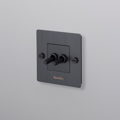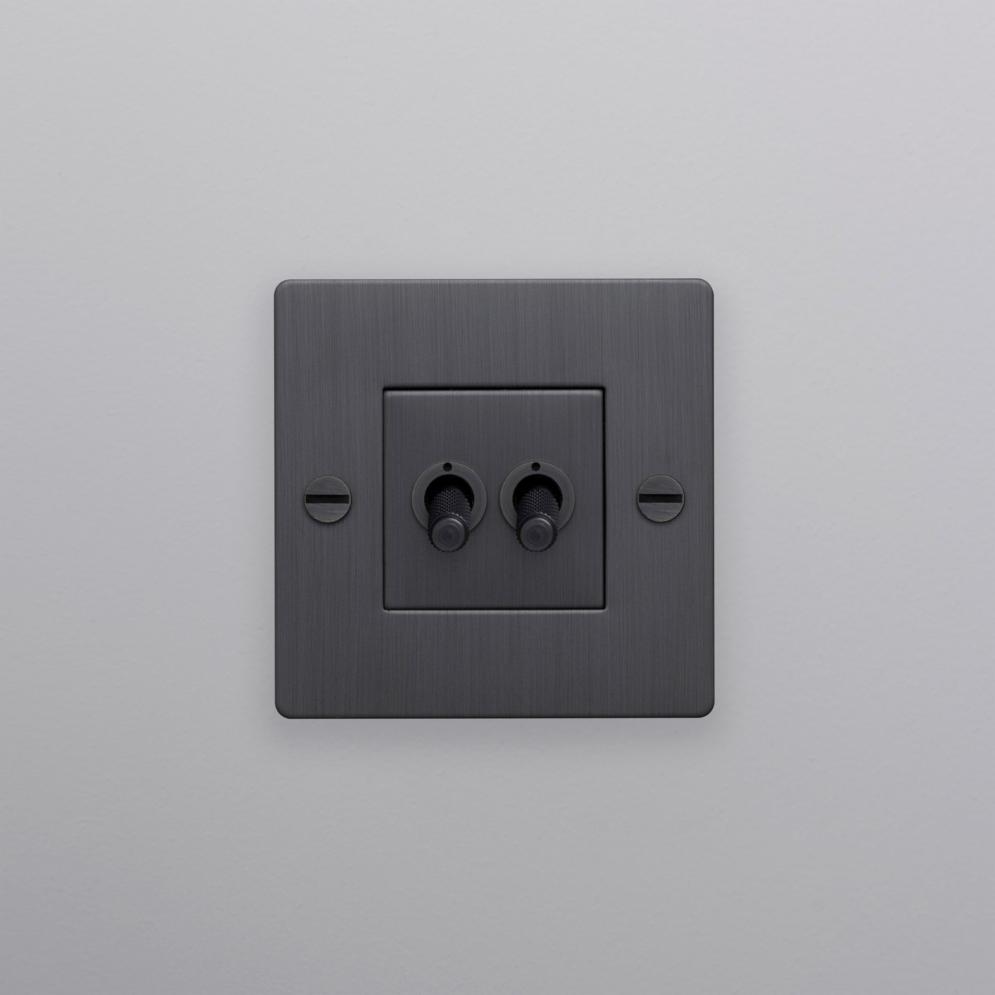 1G double retractive switch in smoked bronze with solid metal levers and a diamond-cut knurl pattern. Smart-enabled and ideal for advanced lighting and home automation. 4 mm shadow gap for a luxurious look.