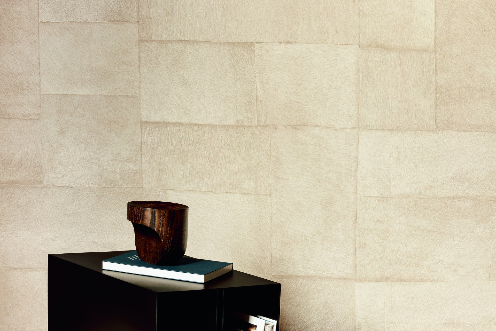 An exceptional vinyl wallpaper with an embossed brushed pony coat. The shiny irregular areas form a beautiful patchwork pattern that demands to be touched.