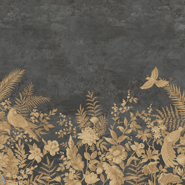 Barraband's Garden wallpaper from Arte. This wallpaper shows a landscape full of flora and fauna. A striking panorama wallpaper. Wallpaper Barraband's Garden Omexco by Arte from the Birds of Paradise wallpaper collection.