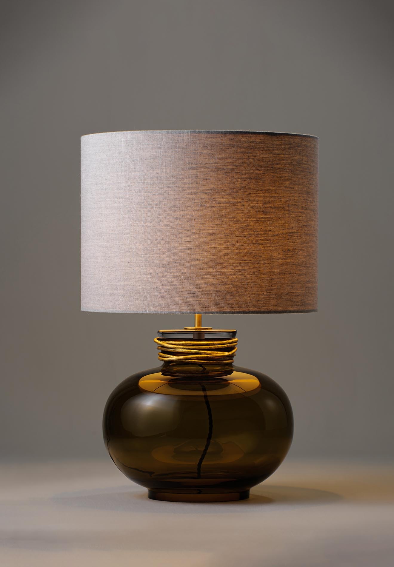 The Boudica Lamp by Porta Romana takes its inspiration from a 5,000-year-old glass artwork on display at the Egyptian Museum in Cairo. Its timeless design combines history with contemporary elegance. A handcrafted, turned metal collar gives the lamp a refined and artisanal character.