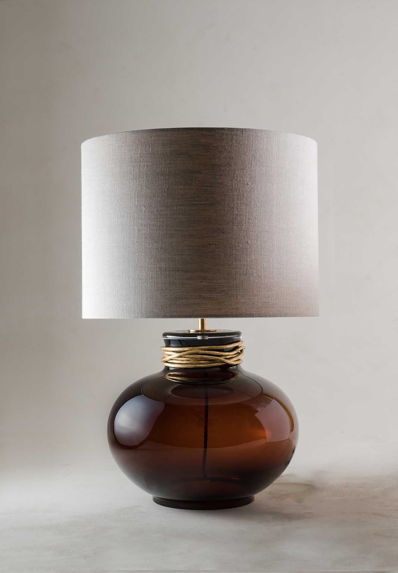 The Boudica Lamp by Porta Romana takes its inspiration from a 5,000-year-old glass artwork on display at the Egyptian Museum in Cairo. Its timeless design combines history with contemporary elegance. A handcrafted, turned metal collar gives the lamp a refined and artisanal character.