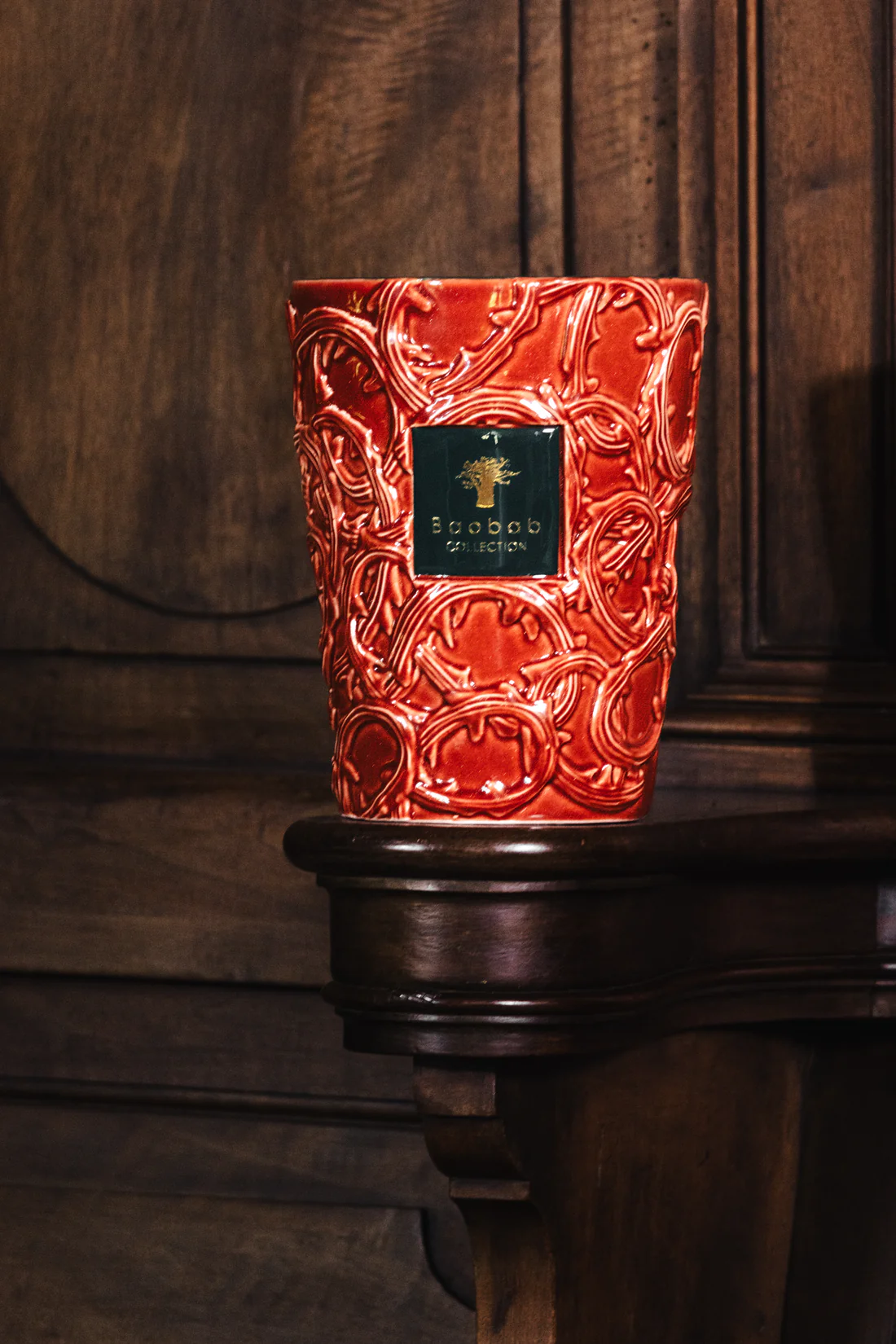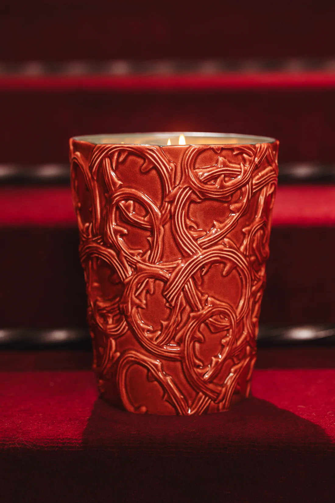 The ceramic of the Artemis scented candle is handcrafted in an artisan workshop in Portugal. The decor of intertwined deer antlers is covered with a glossy terracotta glaze that catches the light and gives this fragrant object plenty of radiance. On the inside near the flames, you will discover a dark green matte glaze that perfectly matches our brand's signature label.