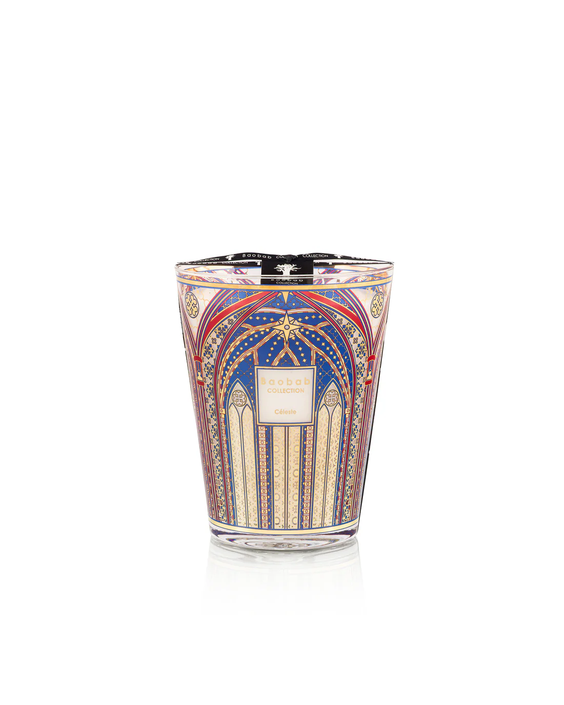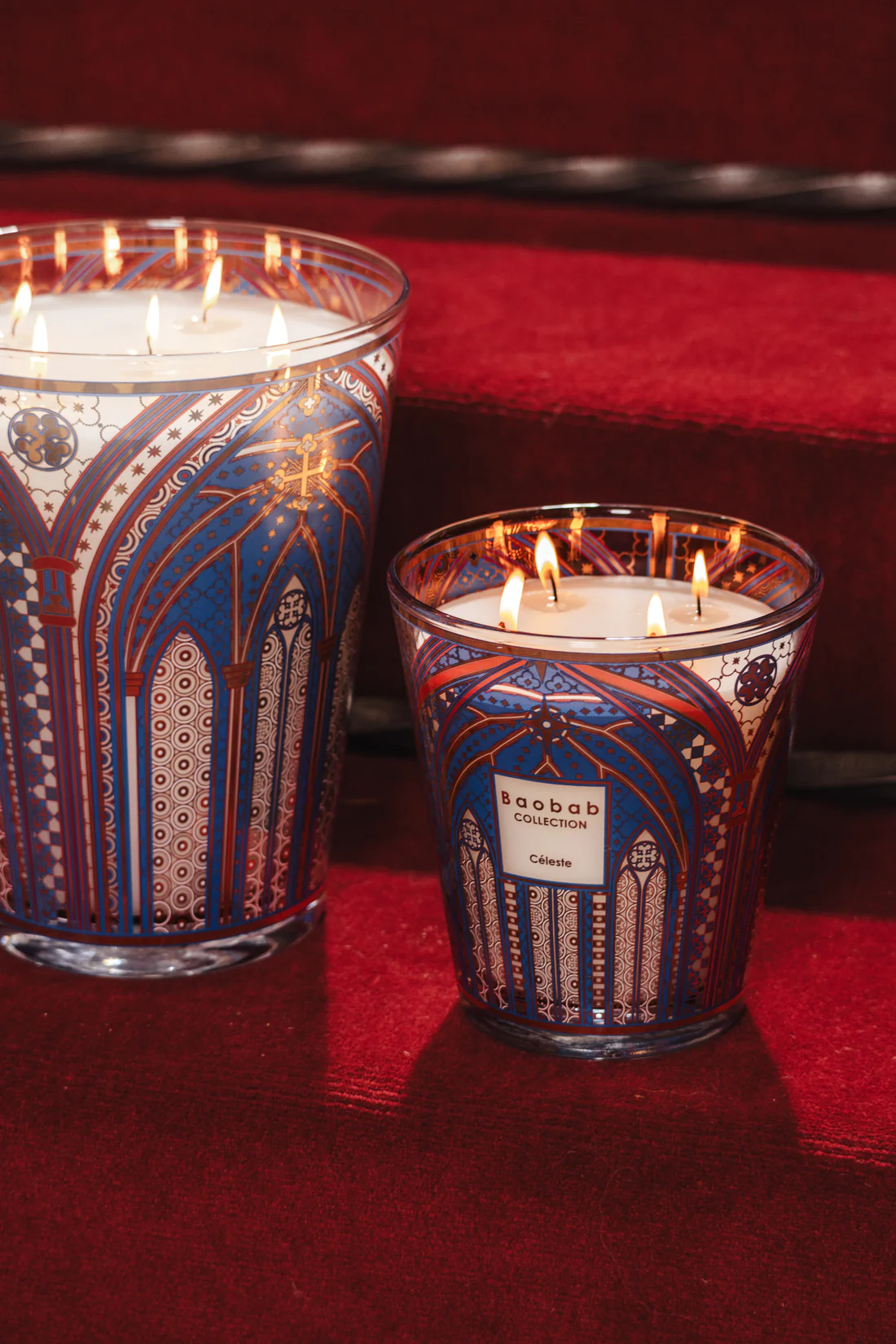 The Céleste scented candle is decorated with a screen print in 24-karat gold and deep blue, reminiscent of the architecture of the vault of Krakow Cathedral.