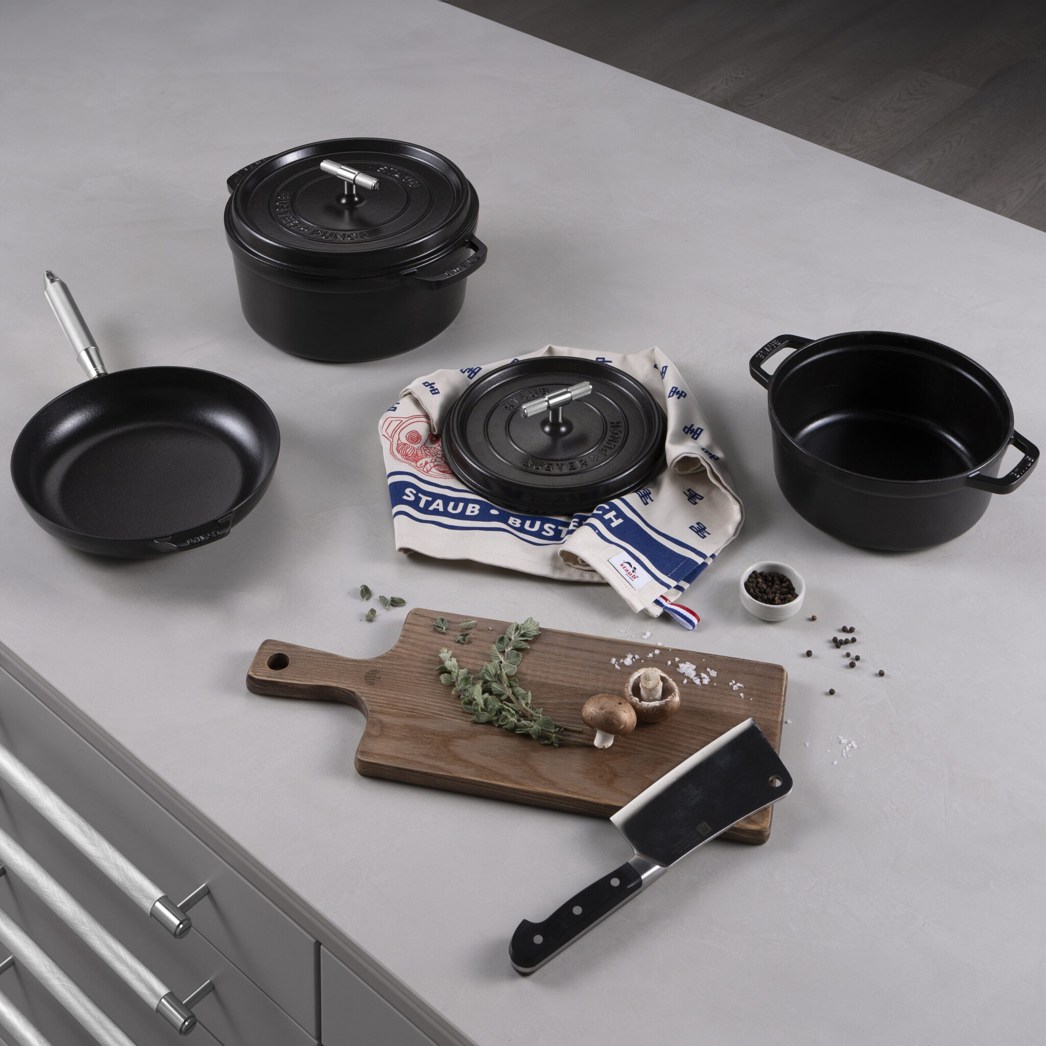 Discover the ultimate combination of functionality and design with this black cast iron cocotte, a collaboration between Buster + Punch and Staub. The cocotte features Buster + Punch's signature T-bar handle, featuring diamond-cut cross knurling for maximum grip and control while cooking.
