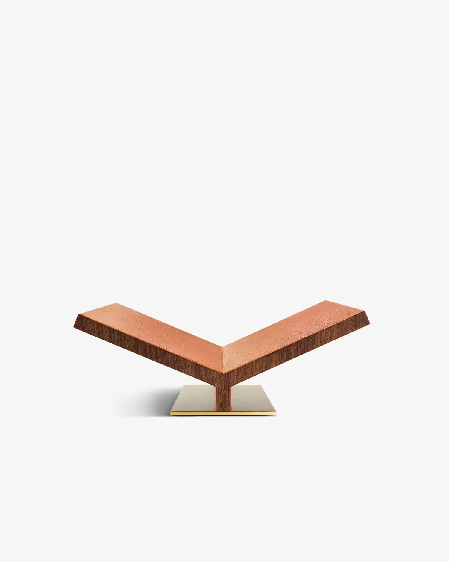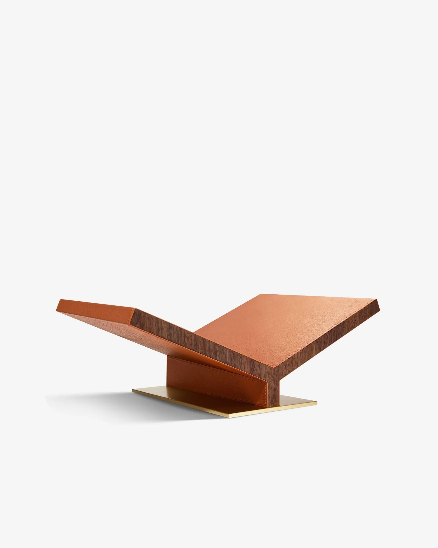 The Collector Bookstand is sculptural in form, crafted from walnut, leather, and brass. Available in two sizes and refined tones—elevating any book into art.