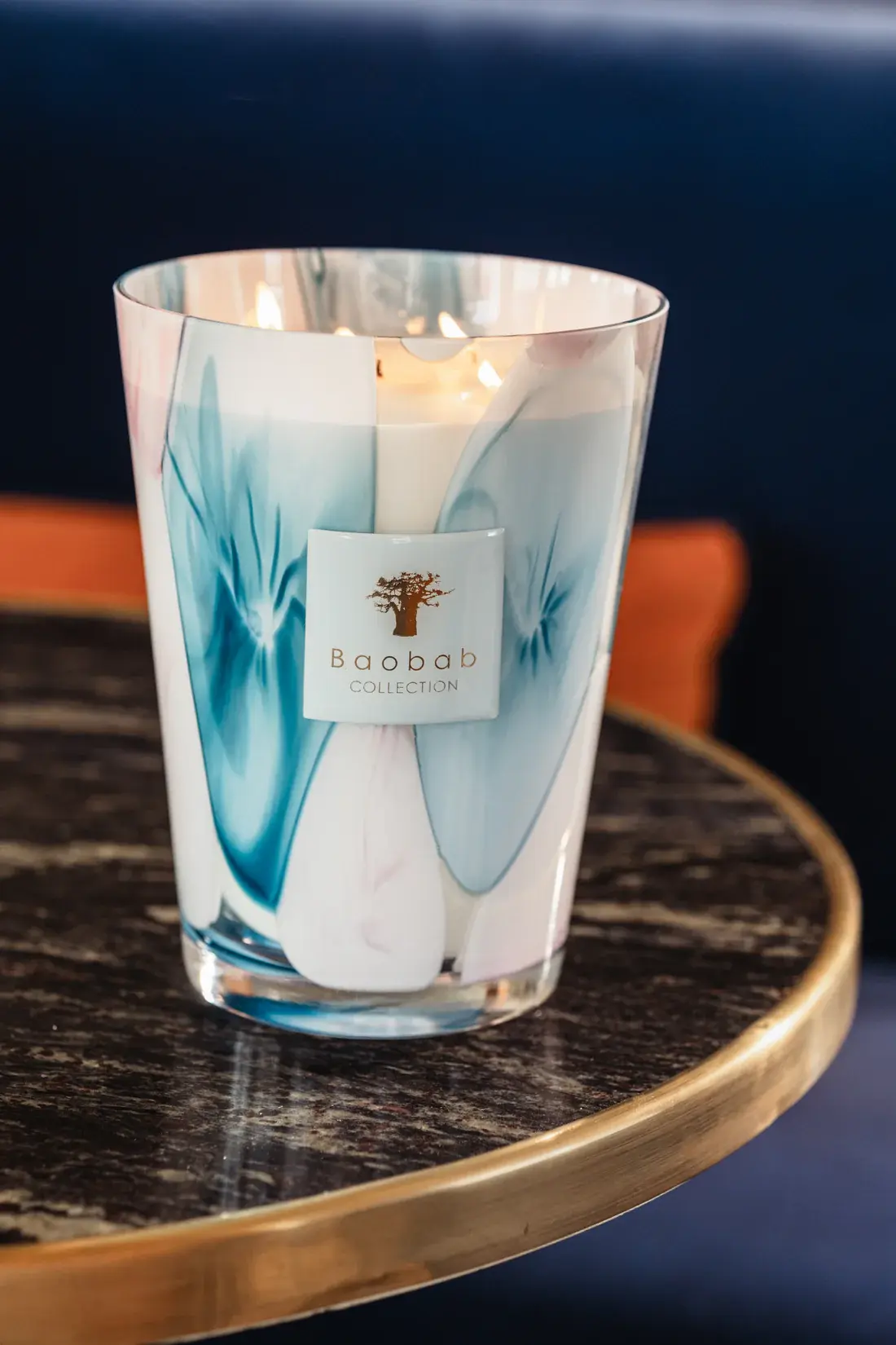 The Leopolda scented candle blends transparent glass with pink and sky-blue accents, like floating bubbles. A tribute to Villa Leopolda on the French Riviera, where luxury and craftsmanship unite in fragrance and design.