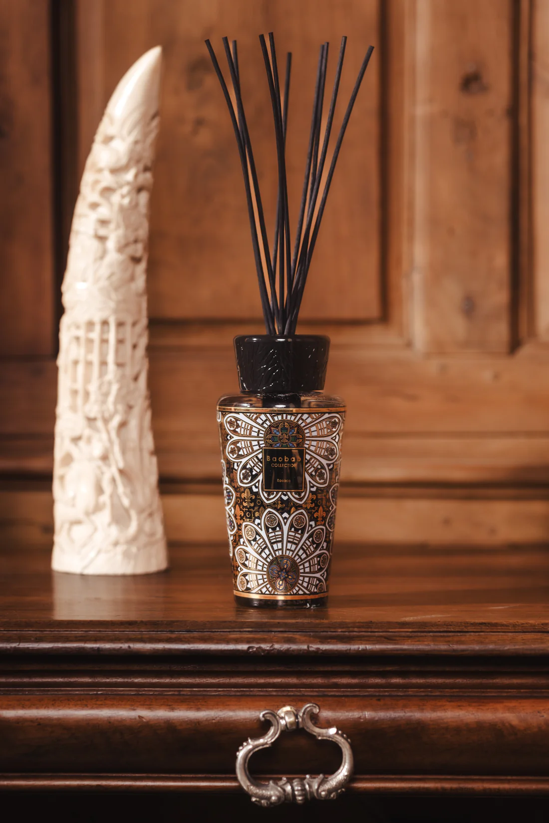 The Rosace fragrance diffuser pays tribute to Gothic architecture and the majestic stained-glass windows of cathedrals. Its glass is adorned with a 24-carat gold silk-screen print, featuring geometric motifs drawn from medieval rose windows.