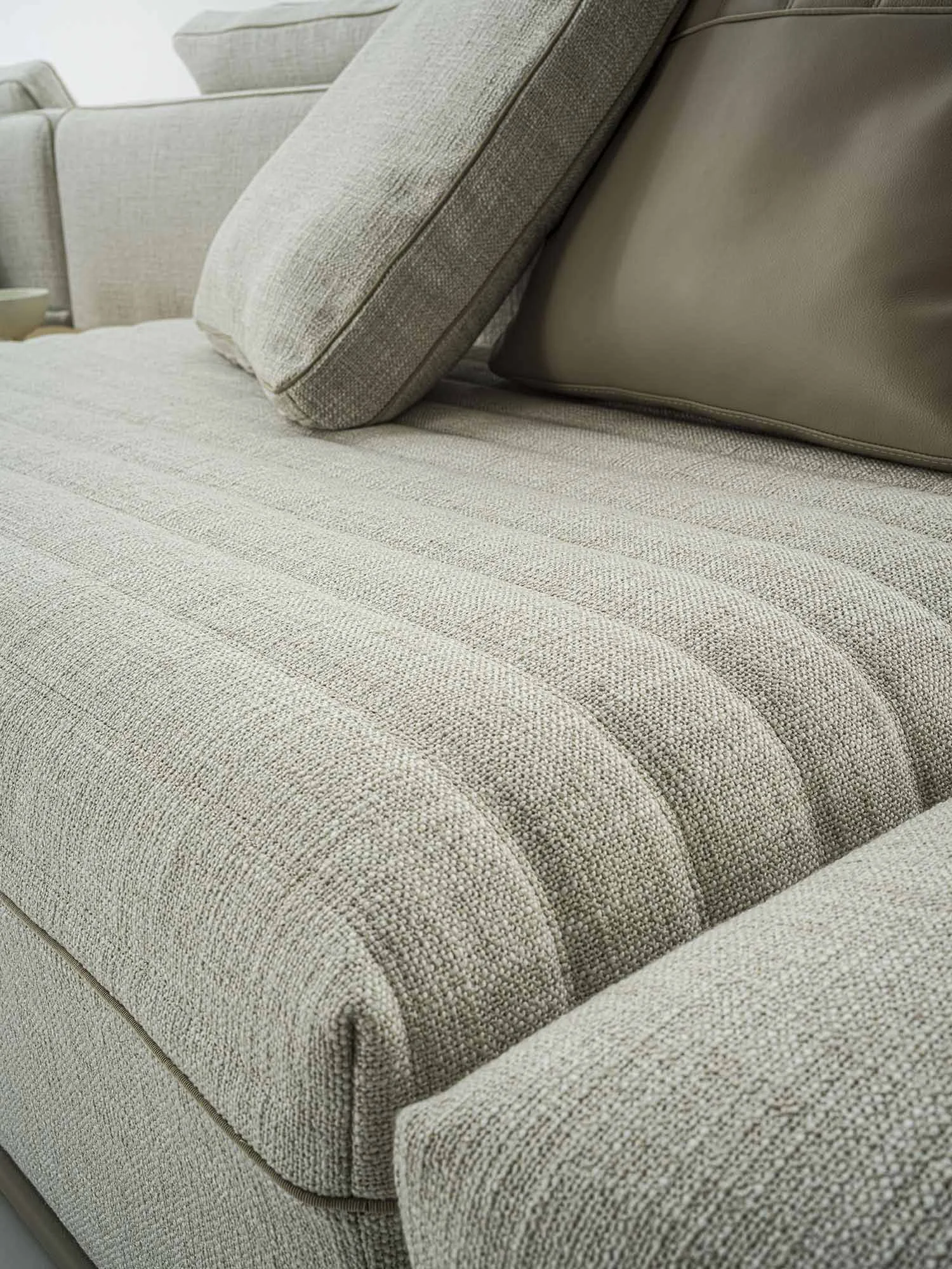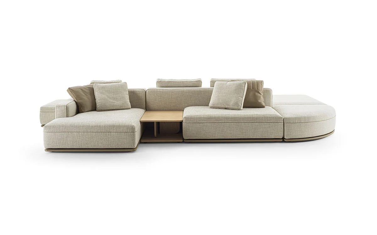 A slim wooden base, upholstered in fabric or leather, rests on concealed feet and supports the generous monovolume seat cushions. These can be finished in smooth upholstery or enhanced with a refined horizontal quilting that runs seamlessly along the seat, adding texture and visual depth.