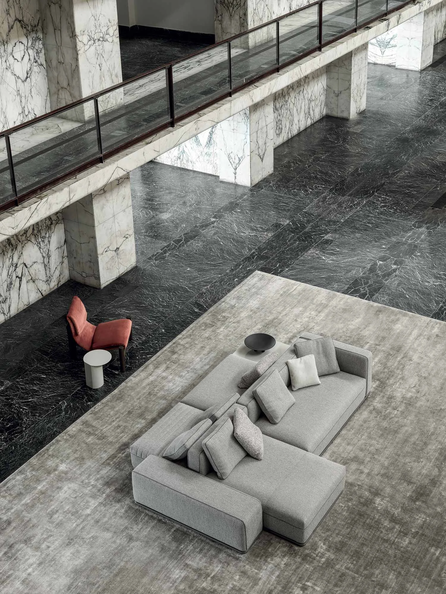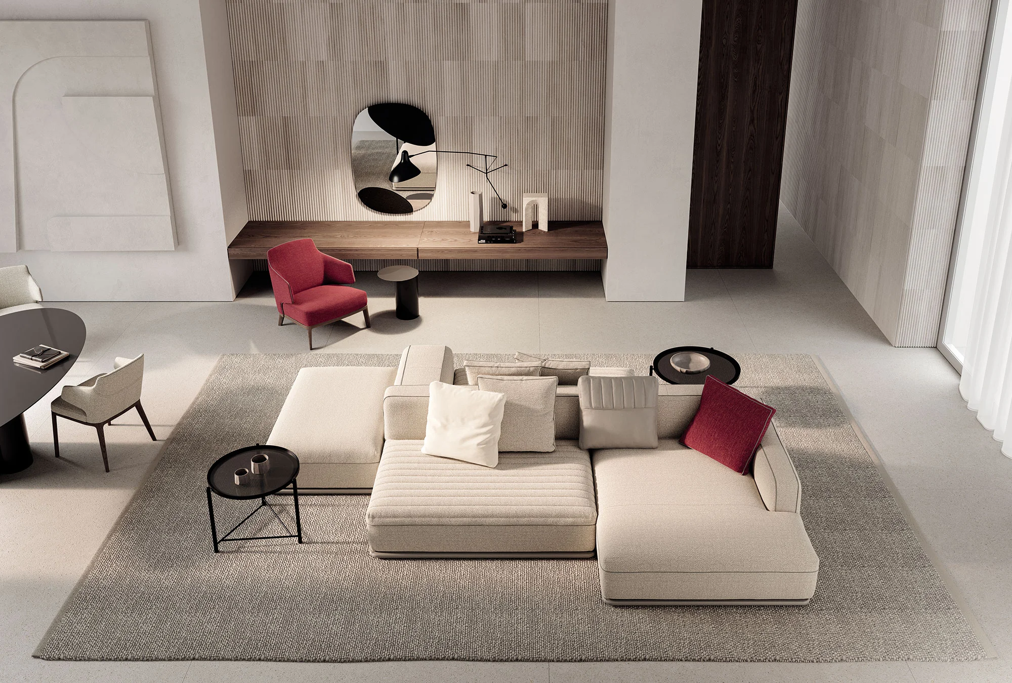 The Eddie Double modular sofa is the double-sided evolution of the Eddie collection, conceived to be placed freely within a space. Its dual orientation transforms the sofa into a defining architectural element, shaping environments with balance and elegance.