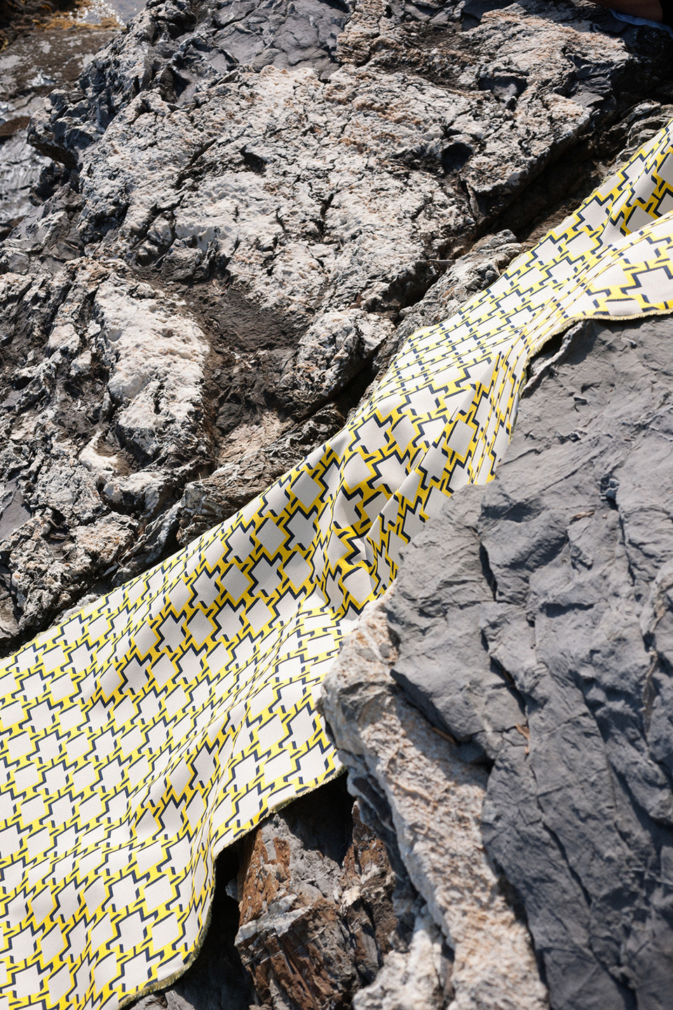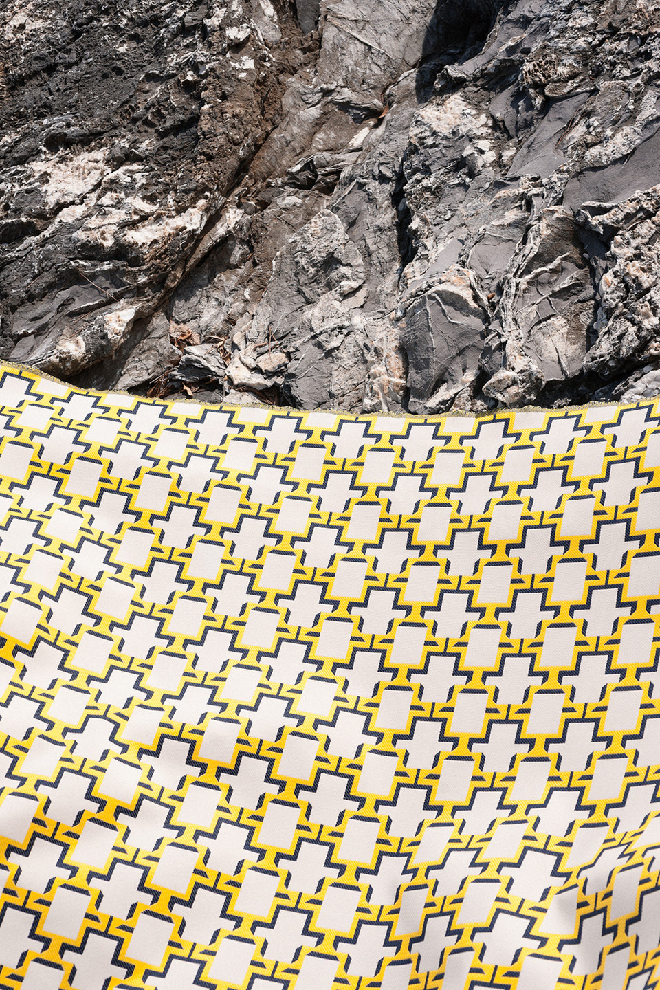 Durable outdoor upholstery fabric with a geometric design. Resistant to UV, weather, chlorine and saltwater. Easy to clean with water and bleach. Made in Italy. Martindale: 36,000.