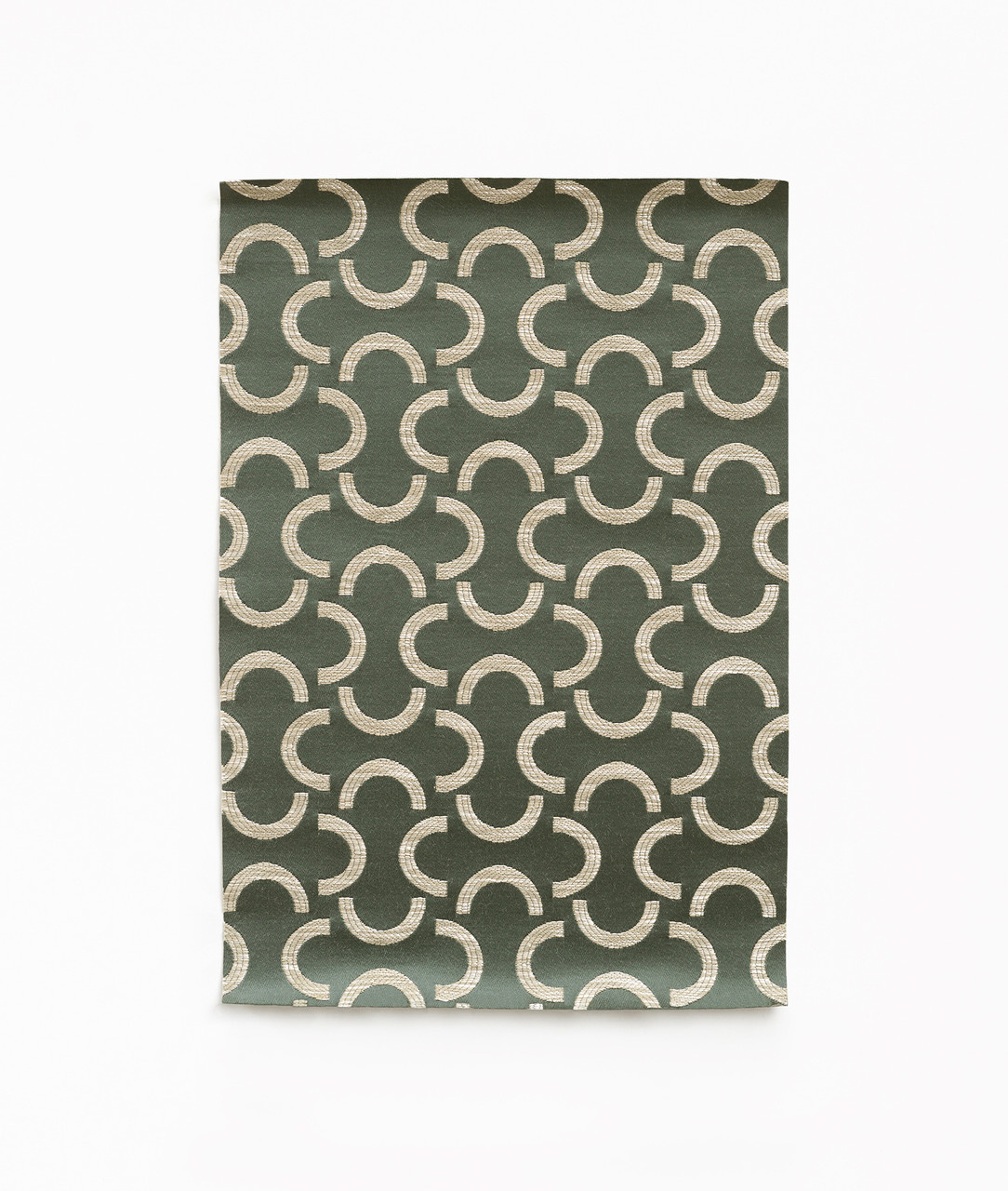 Fabric whose geometric motif is generated by the contrast between the shiny satin background and the rustic yarn of the relief pattern with its metallic reflections. For medium-intensity seating.
