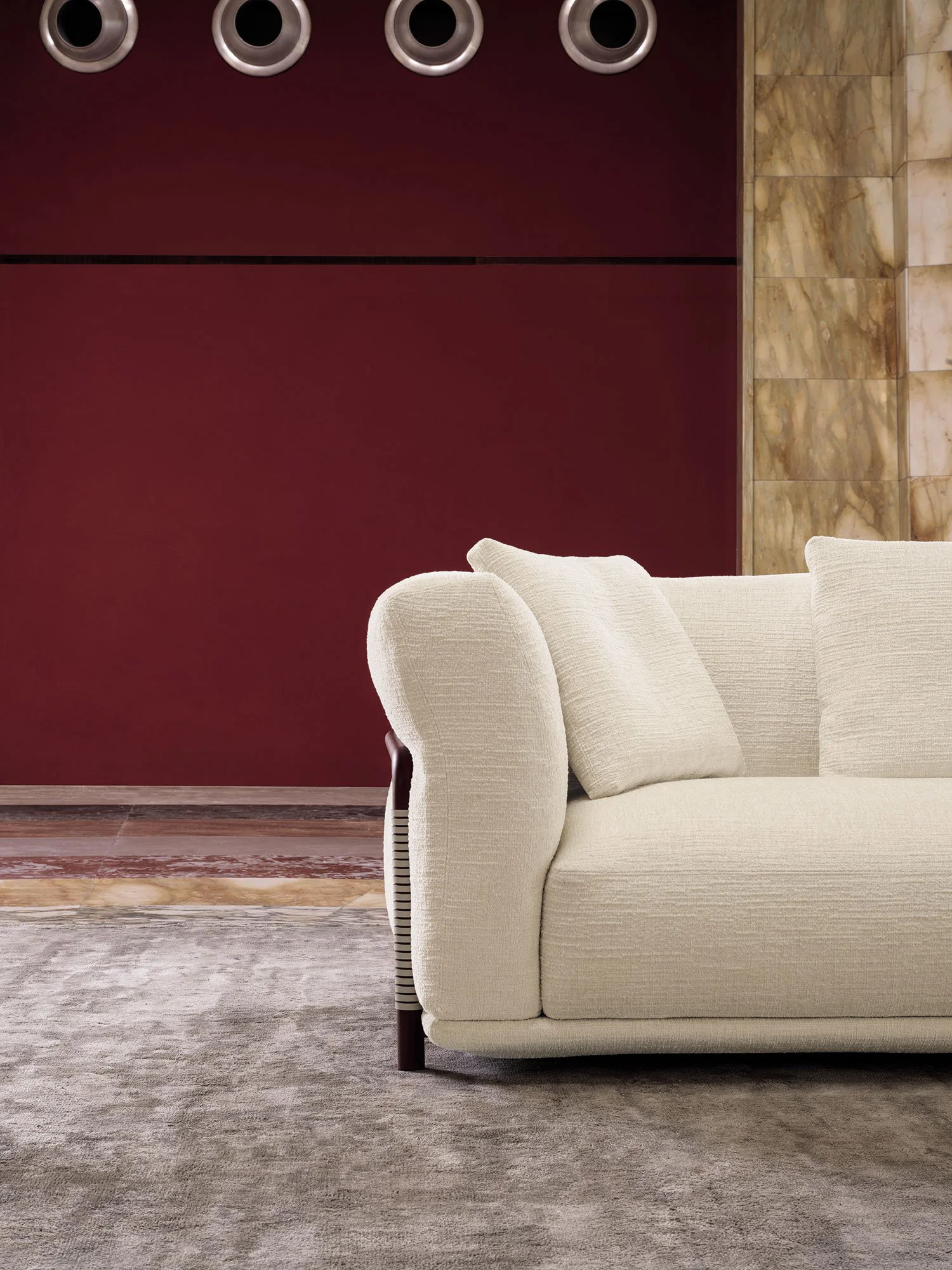 Generous seats, soft backrests and sculpted armrests are designed to offer maximum comfort. The sofa is framed by a slender metal perimeter that adds visual lightness and definition. Distinctive details, such as the handwoven leather accents on the armrests and back joints, elevate the design and highlight the fine craftsmanship behind the piece.