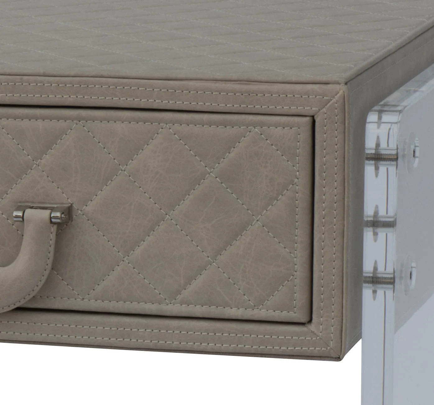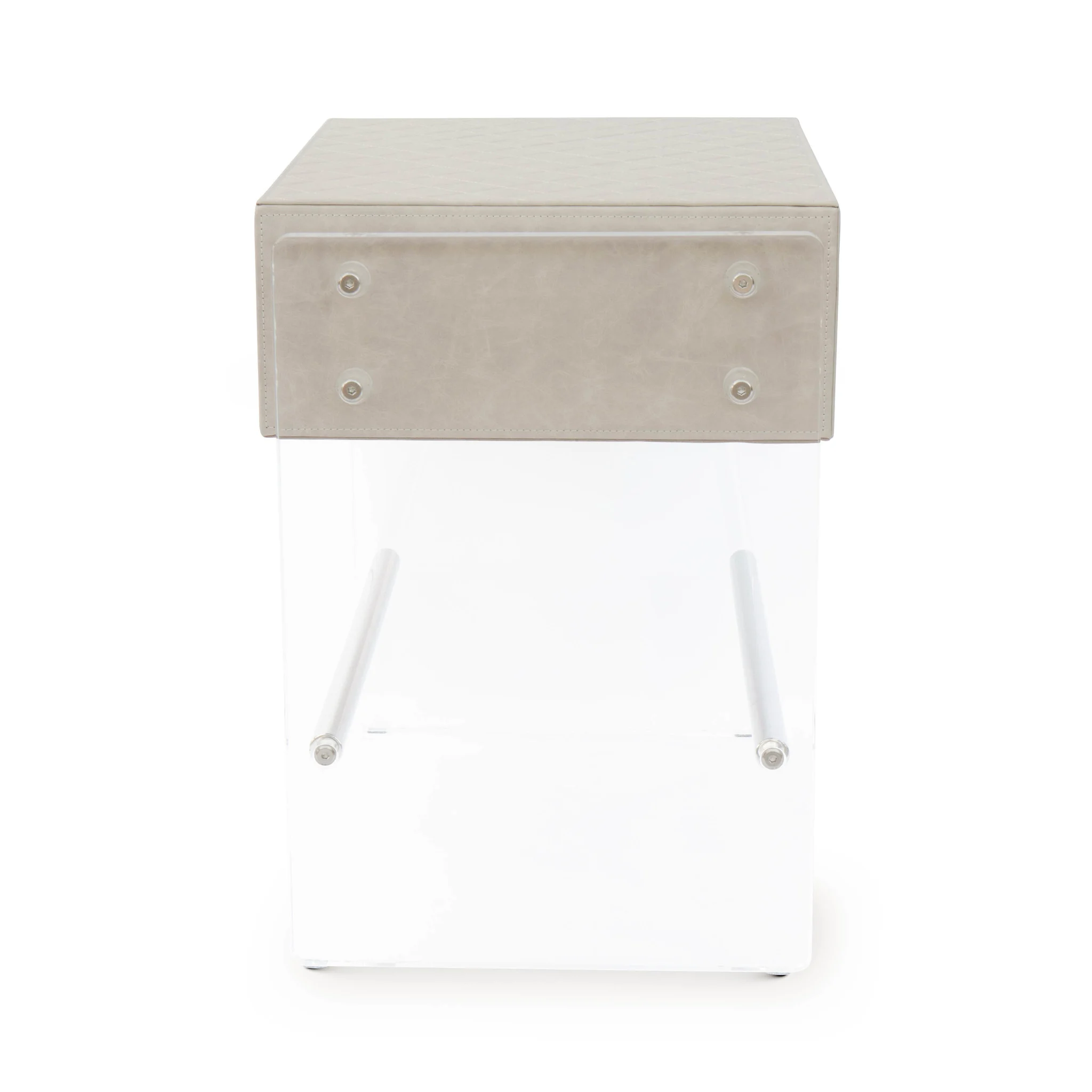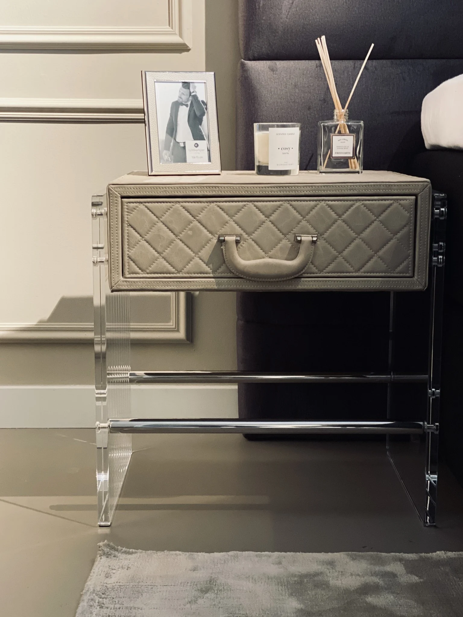 The Genova side table is a sophisticated blend of classic and modern design. The quilted leather gives a sense of luxury and elegance, while the sleek plexiglass legs create a contemporary, airy effect.