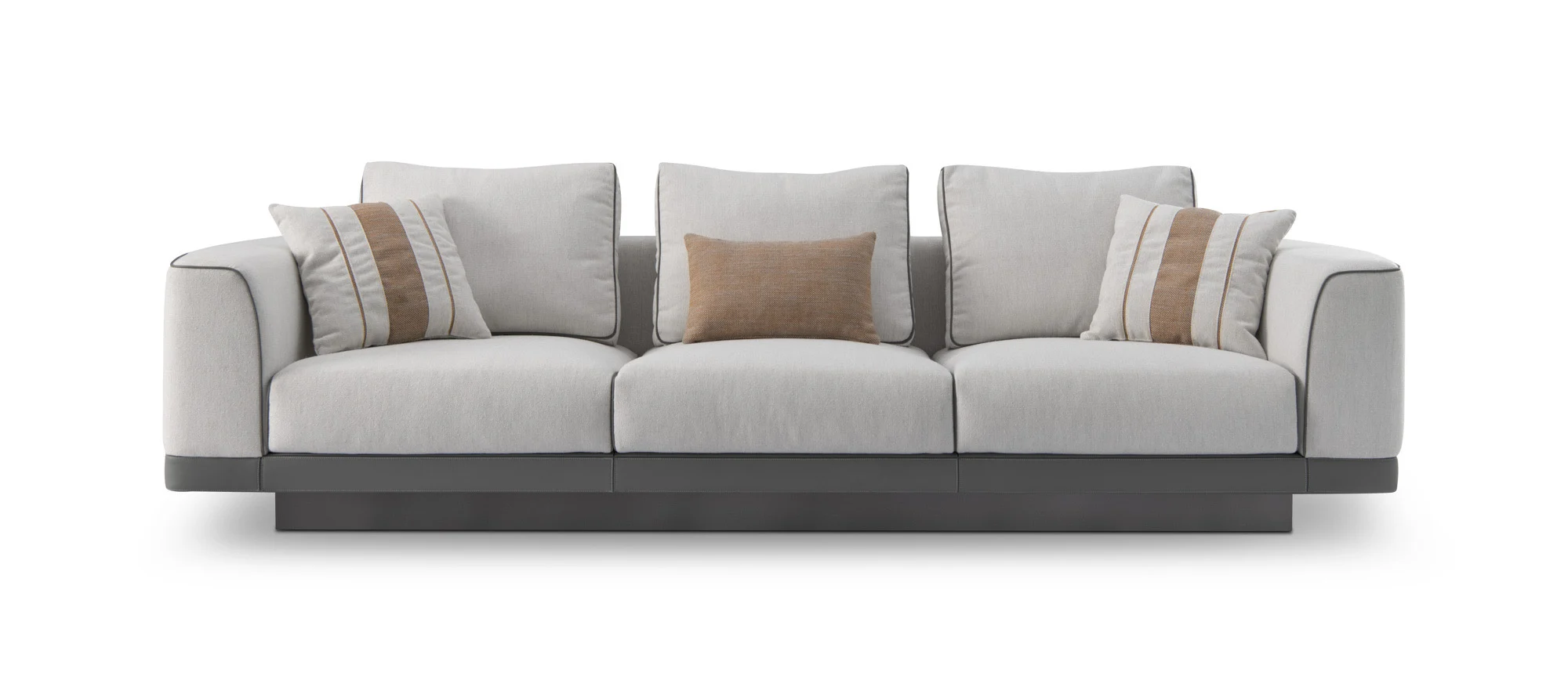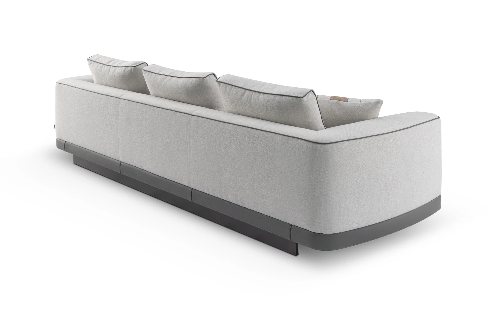 Luxury sofa in soft polyester-linen blend, Italian design. Elegant leather piping and slim gunmetal base. Modern, timeless and stylish comfort.
