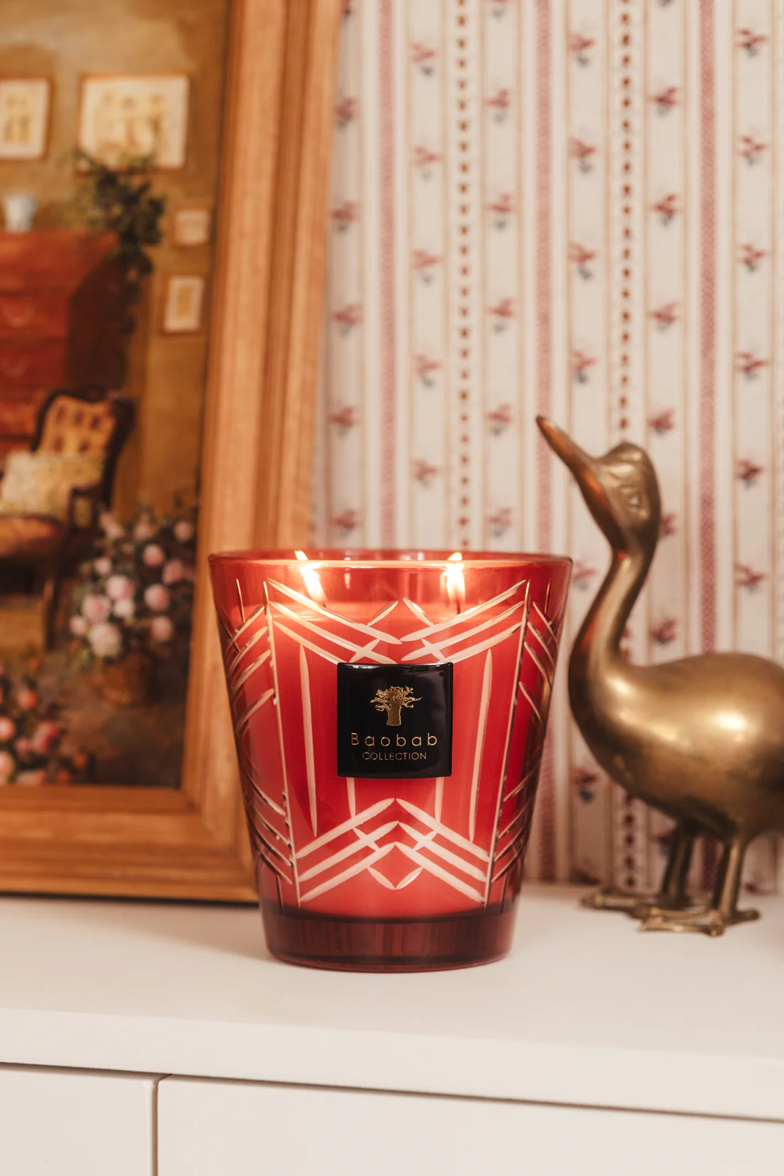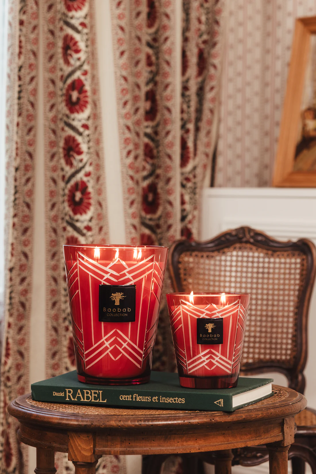 The Cernay scented candle is hand engraved by artisans in our workshops, with graphic lines from the great tradition of glass engraving. The glass is first painted dark red by hand, preserving its transparency. This transparency is essential, because the craftsman must be able to see through the lines he is about to engrave.
