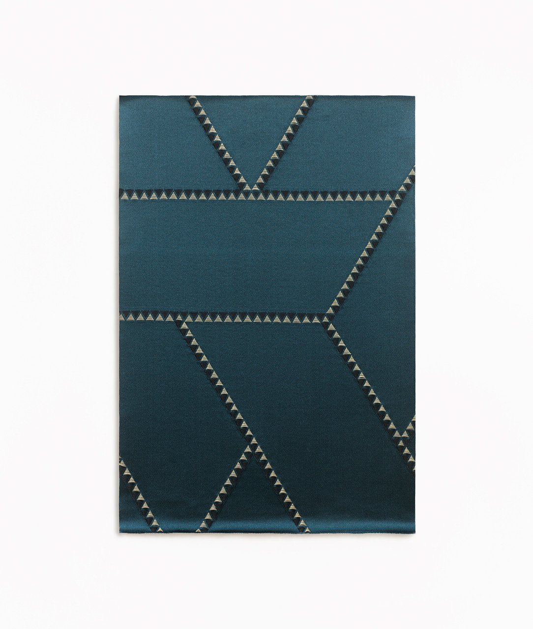 This exclusive curtain fabric is distinguished by a subtle 3D geometric pattern, reminiscent of fine inlays of ebony and mother-of-pearl. The combination of lustrous metallic threads and matte, voluminous threads on a satin base gives the fabric a unique depth and tactile richness.
