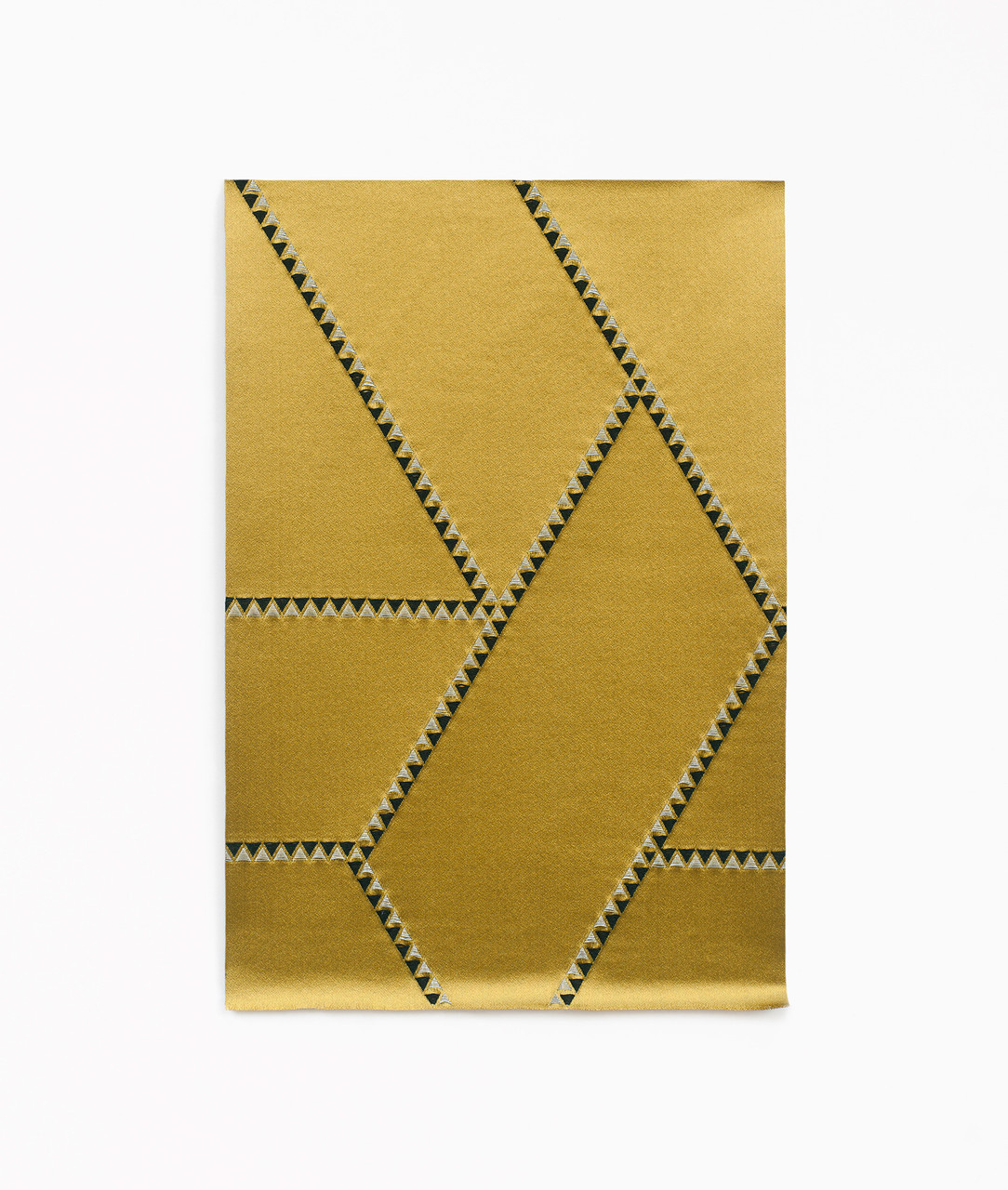 Luxurious curtain fabric with a 3D geometric pattern inspired by mother-of-pearl and ebony. Satin base with a mix of metallic and matte yarns for a rich, layered effect. Manufactured in India.