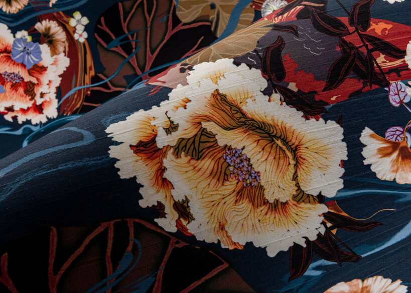This scene of a Japanese pond from above reflects the lush natural beauty of water. Be surprised by the depth of the drawing and discover life above and below water. The silk-look textile stands for elegance and refinement.