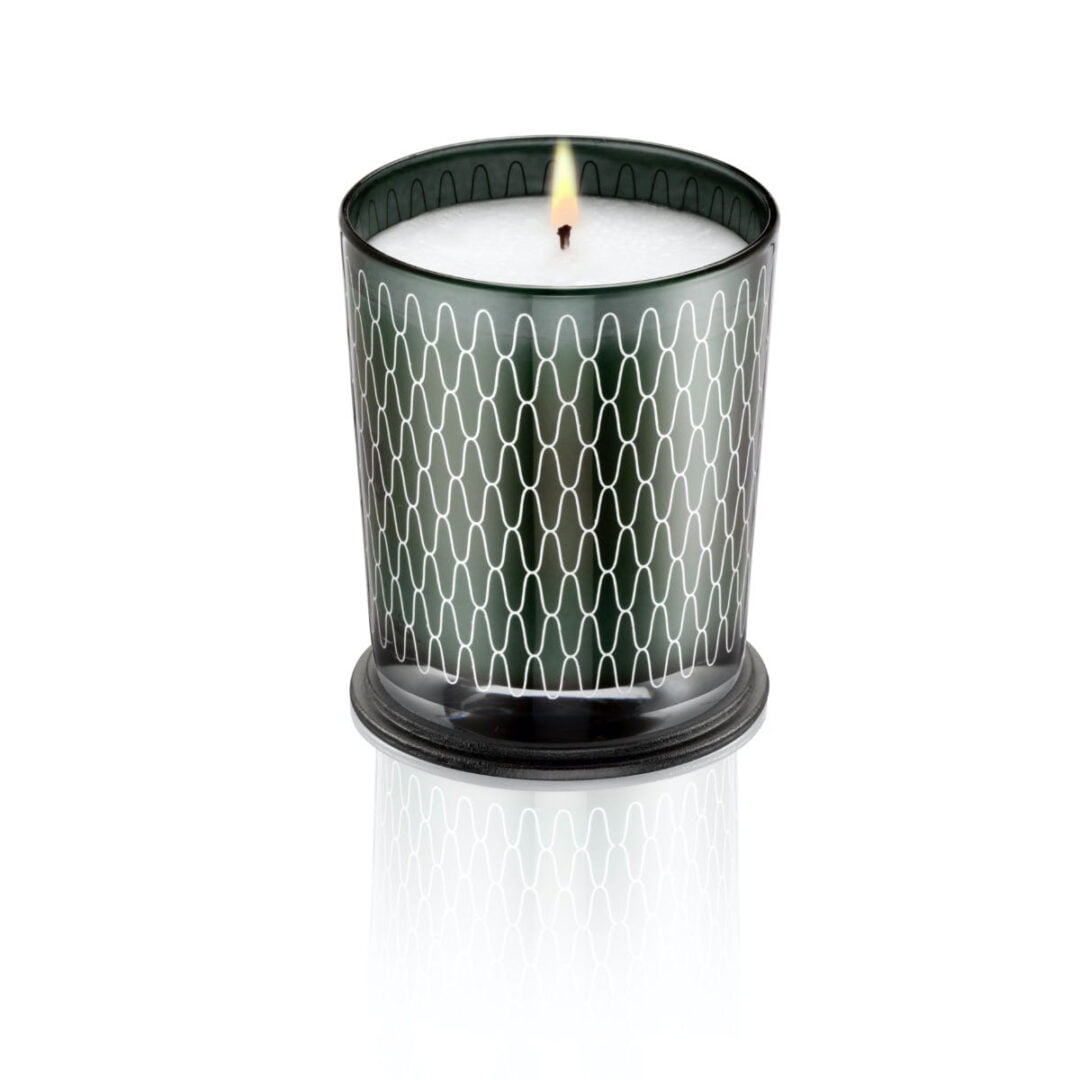 A beautiful scented candle with a delicate continuous silver wave pattern. - Complexity and Relaxation - A creation of red berries balanced with aromatic and balsamic-sweet scents. The sensual base is dominated by the woodiness of Amber herb and Gurjun ba