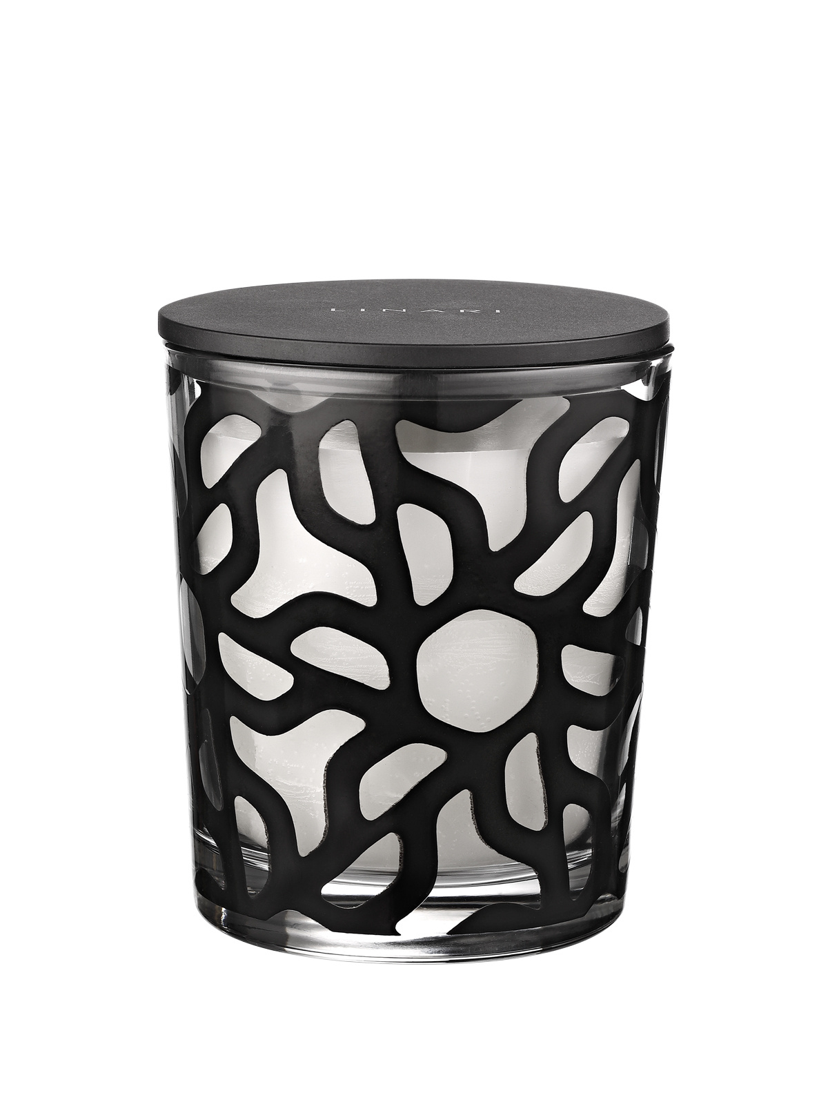 The deep black design of this scented candle makes an avant-garde statement. The transparent glass features an abstract, ebony pattern that weaves mysteriously around the glass. The natural color of the wax enhances the minimalist design. Finished with a matte black lid made of solid bakelite with silver LINARI logo. It also serves as a decorative trivet for all LINARI candles and diffusers. Burn time up to 45 hours.