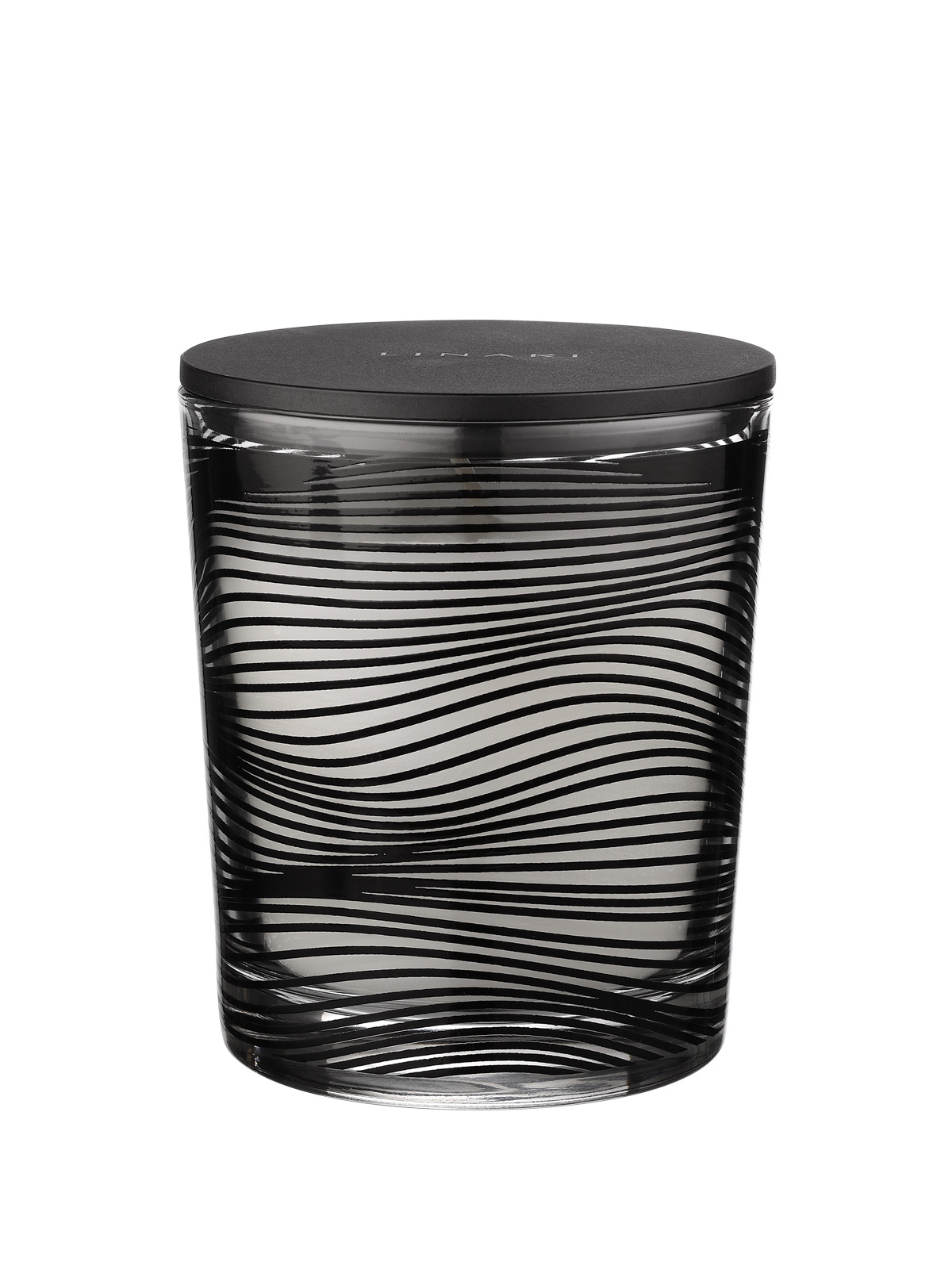 The elegant design of the candle glass is a stylish highlight. The contrast between the transparent glass and the deep black wavy pattern gives the candle an organic look. The natural color of the wax enhances the minimalist design. The matte black bakelite lid with silver LINARI logo also serves as a decorative trivet for all LINARI candles and diffusers. Burn time up to 45 hours.