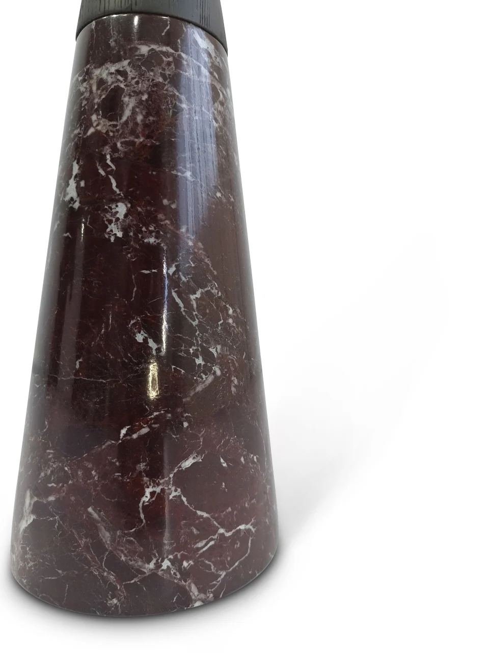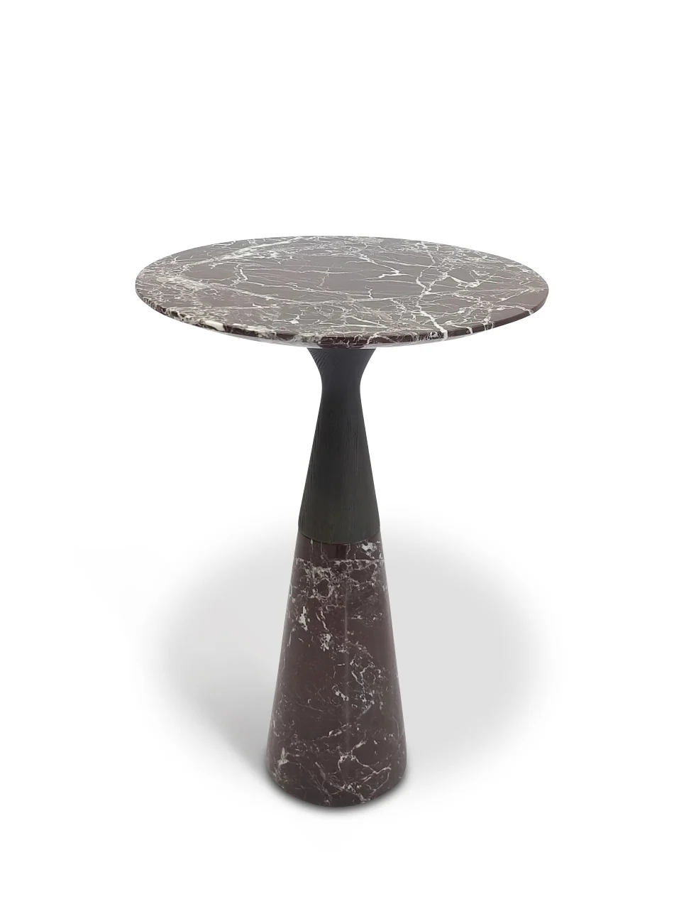 The Mizu side table combines a burgundy top with a tapered marble leg. Timeless design and natural materials come together in an elegant contrast of warm and cool tones.