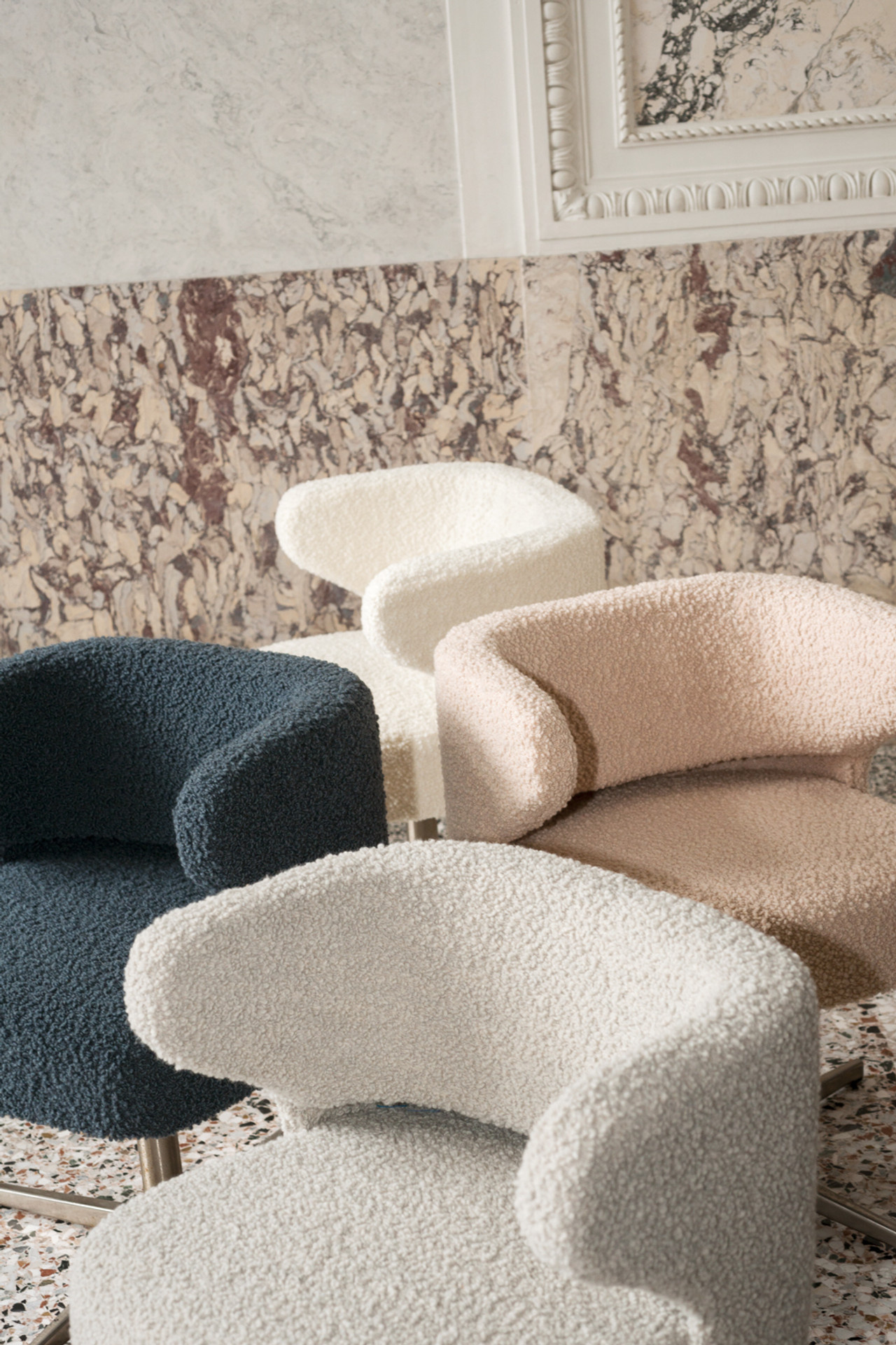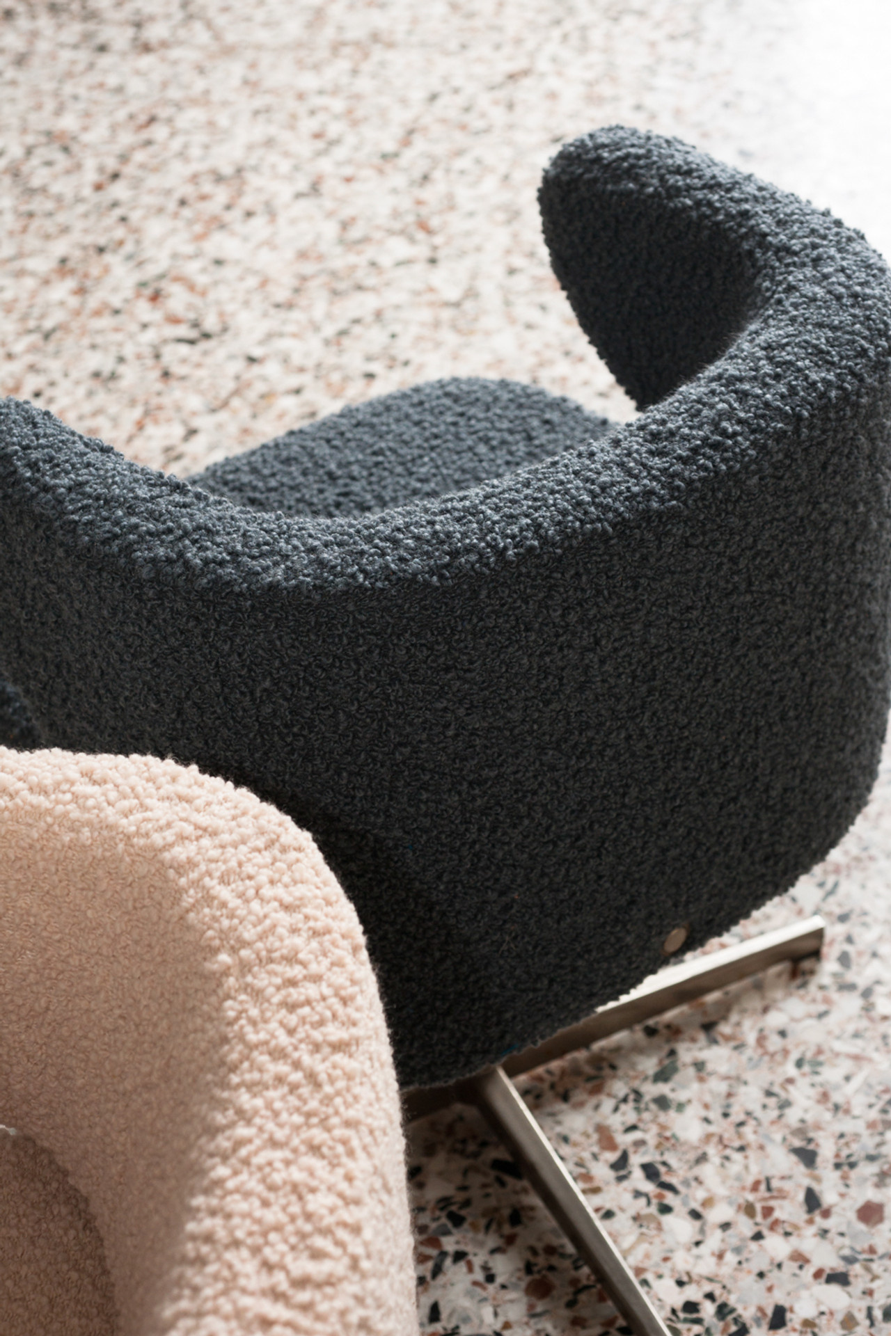 This wool bouclé offers the perfect combination of warmth, softness, and durability. The refined color palette of natural and dark tones enhances the pure, unblemished look of the wool. The fabric’s irregular texture adds playfulness and dynamism, giving it a luxurious appearance that seamlessly fits various interior styles.