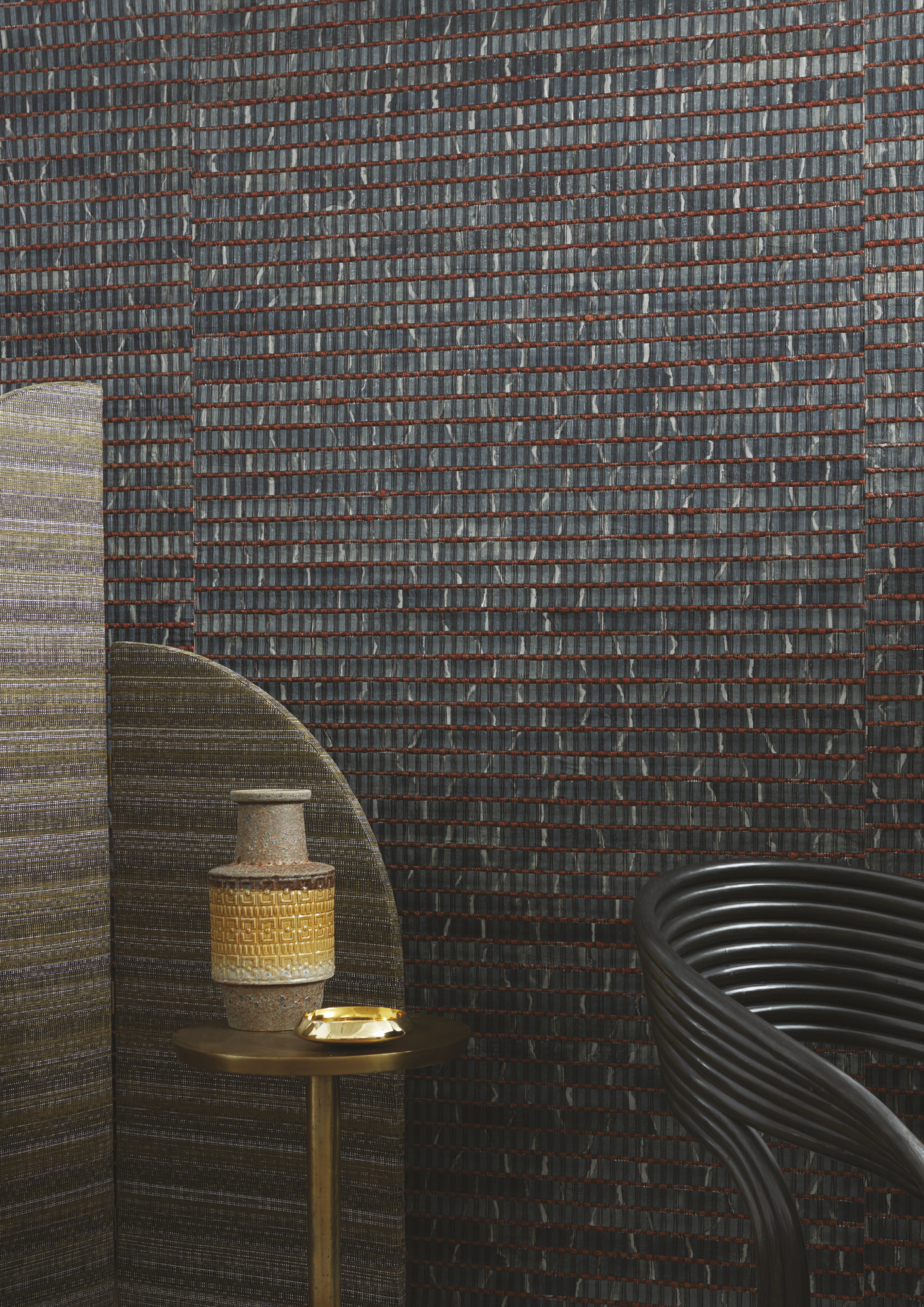 A woven combination of dyed paper strips with dyed coconut fiber creates an elegant set of contrasting stripes.