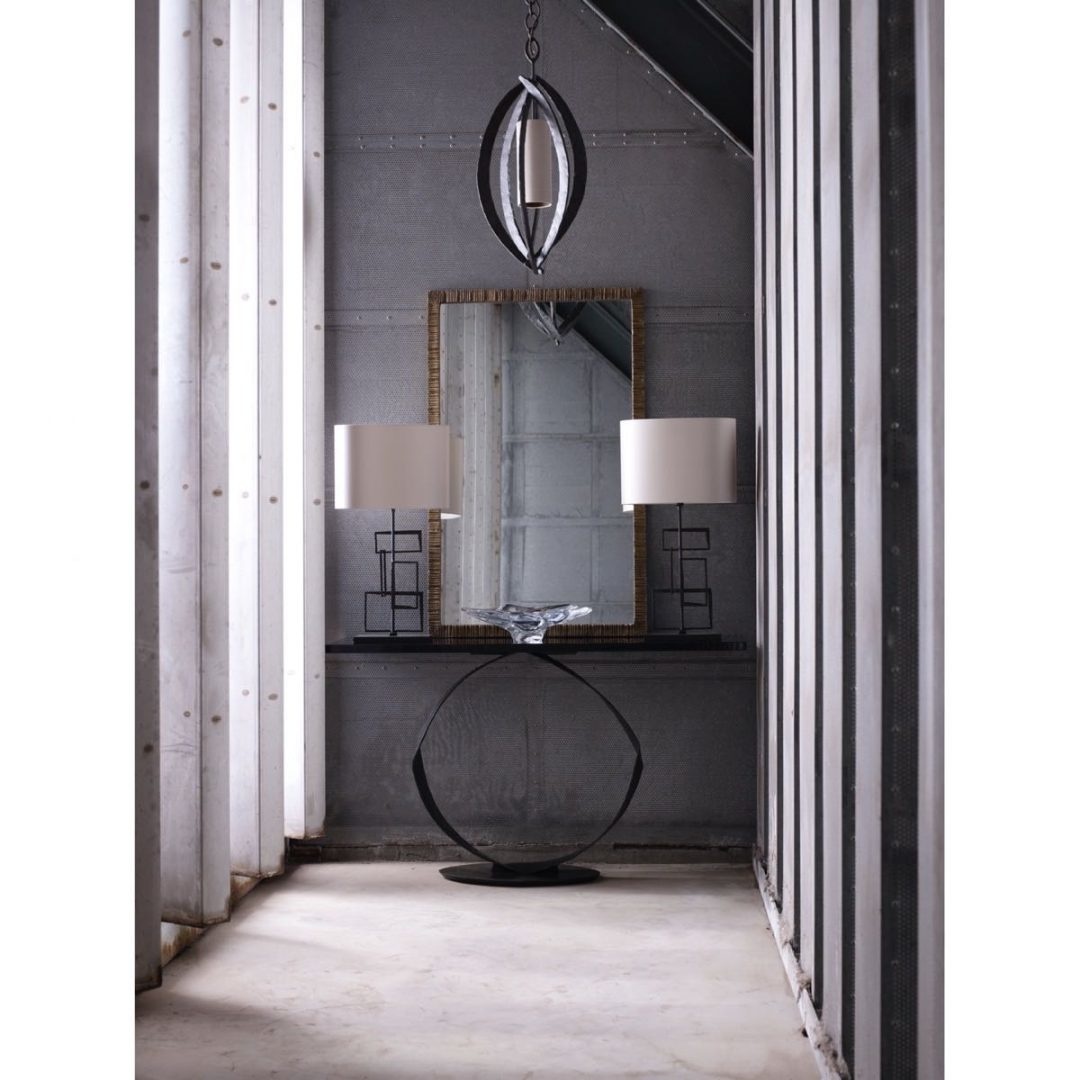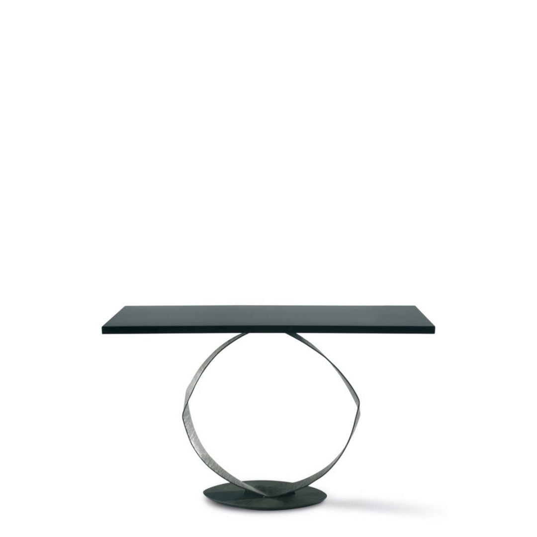 Sometimes the simplest things are simply the best. This console consists of a beautifully forged single twist of metal, struck and patinated in the shape of an off-set circle. A fresh and highly varnished wood top provides a perfect finish.