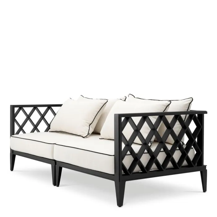 The Ocean Club S Outdoor Sofa with black frame and Sunbrella canvas upholstery combines luxurious comfort with durable outdoor quality. An elegant two-seater sofa that transforms any garden or patio into a stylish lounge.