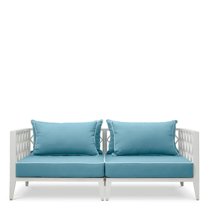 The Ocean Club S Outdoor Sofa brings refined elegance and comfort to your outdoor space. Its sleek white frame creates a fresh, modern contrast with the soft Sunbrella mineral blue upholstery, producing a serene and luxurious aesthetic for patios, terraces and gardens.