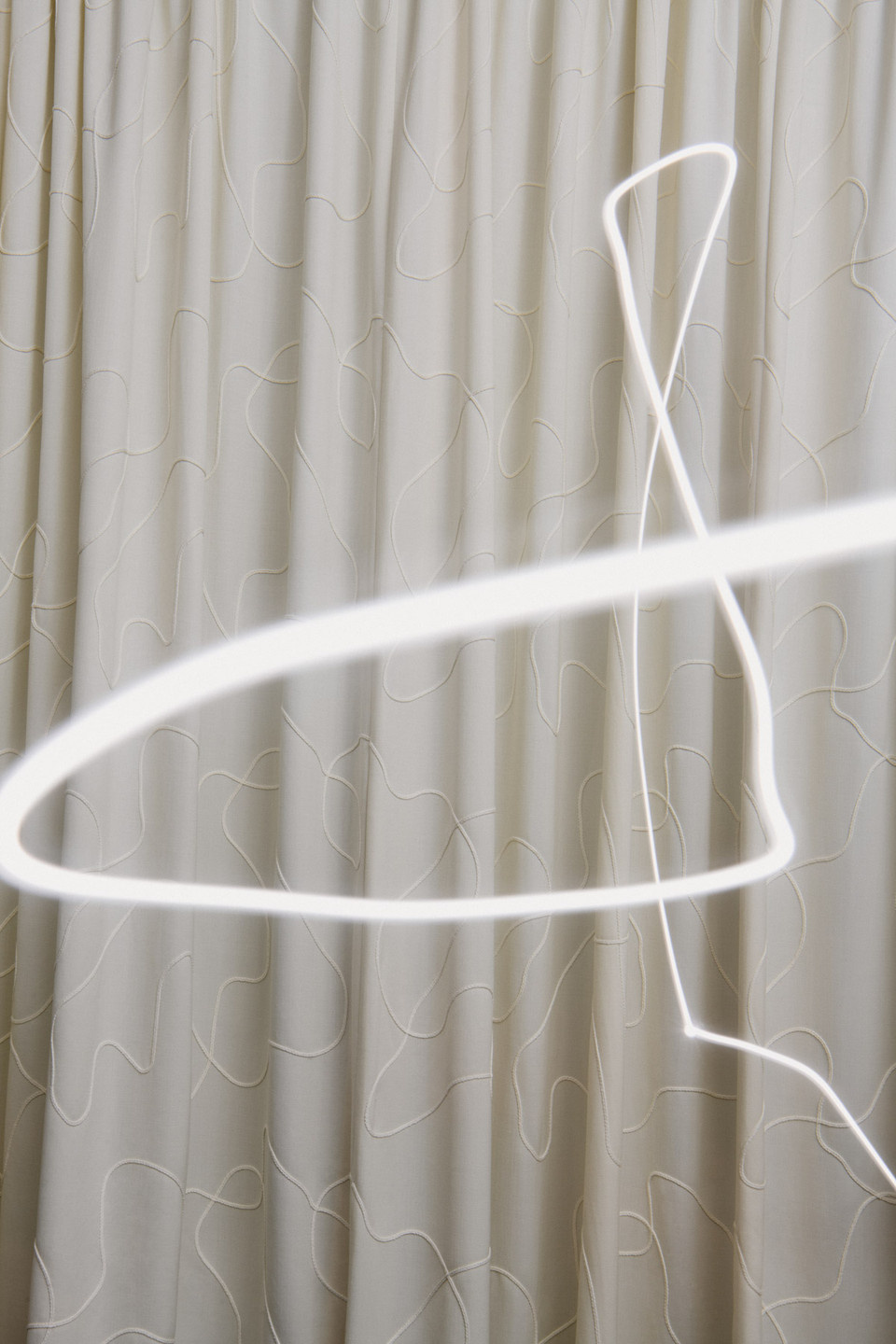 The rich texture of the wool satin and the raised embroidery lines enhance the lines, while the soft fall elegantly transitions into the room. This fabric combines artistic expression with high-quality functionality.