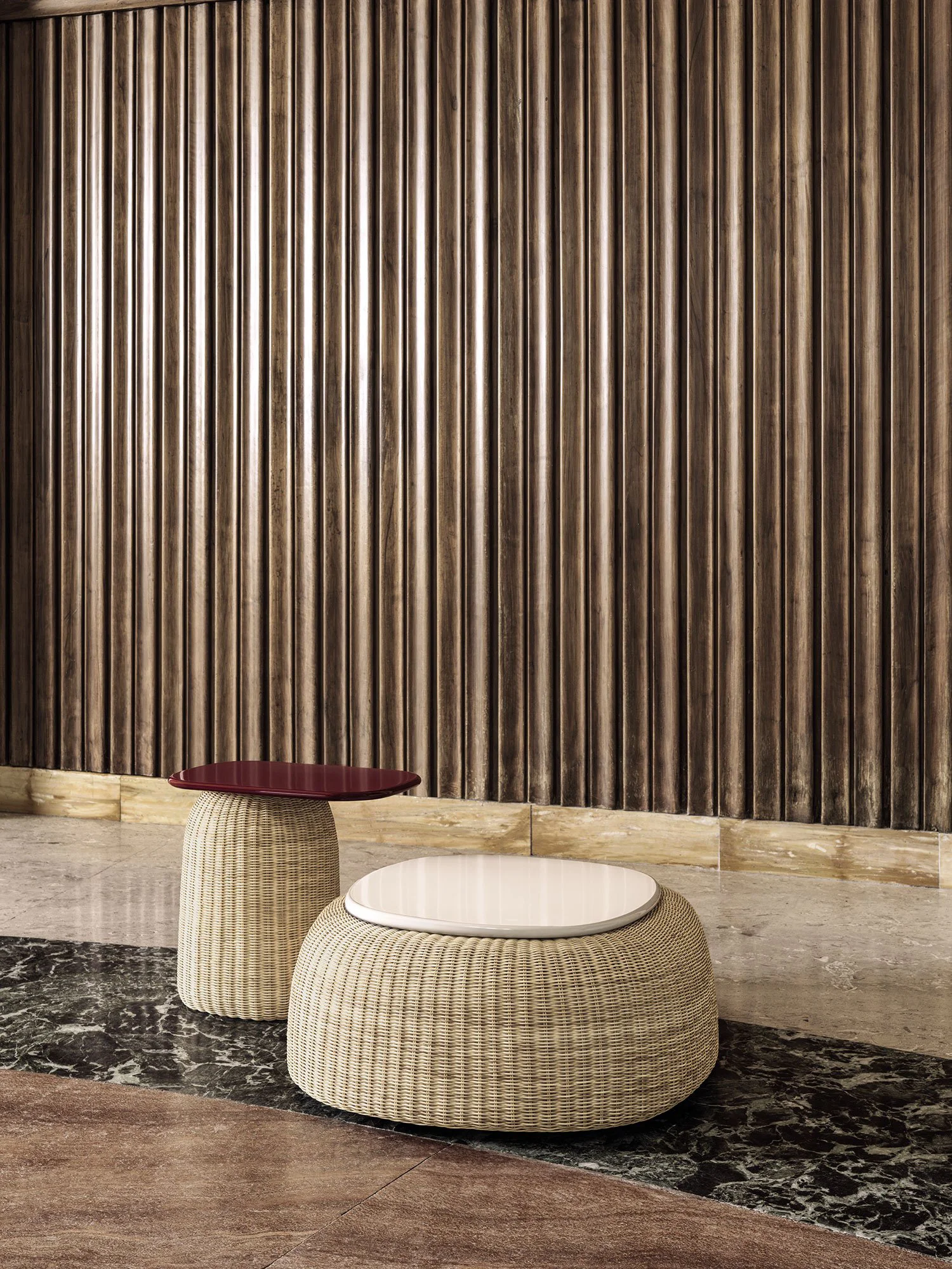 The side table is available in a low, wide version with an interlocking top seamlessly integrated into the woven base. The server offers a taller, more slender profile, distinguished by an asymmetrical lacquered top that introduces a contemporary contrast to the natural wicker.
