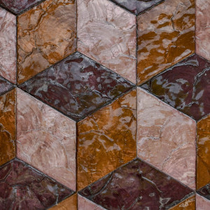 Wall covering made of capiz, oyster-like shells that are manually colored, cut and laid in geometric patterns. Capiz is a real natural product; each shell is unique and differs in color and structure. Set off 5 tiles.