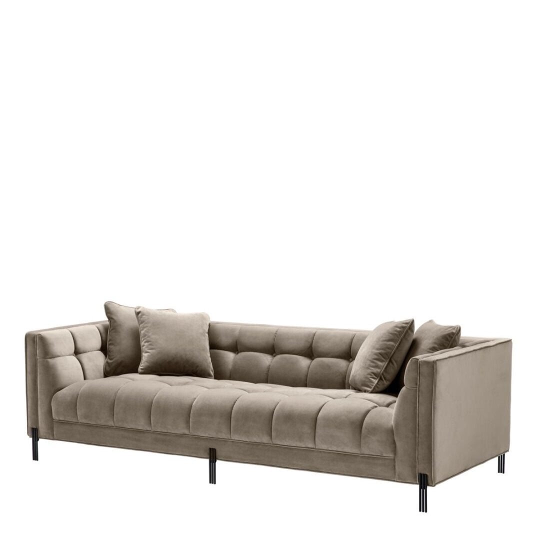 The luxurious Sienna Sofa combines comfort with style. The backrest is T-shaped and forms a whole with the armrests. This elegant, modern sofa comes in upholstery of soft Savona greige velvet, with four square cushions. Gold-finished legs add extra glamou