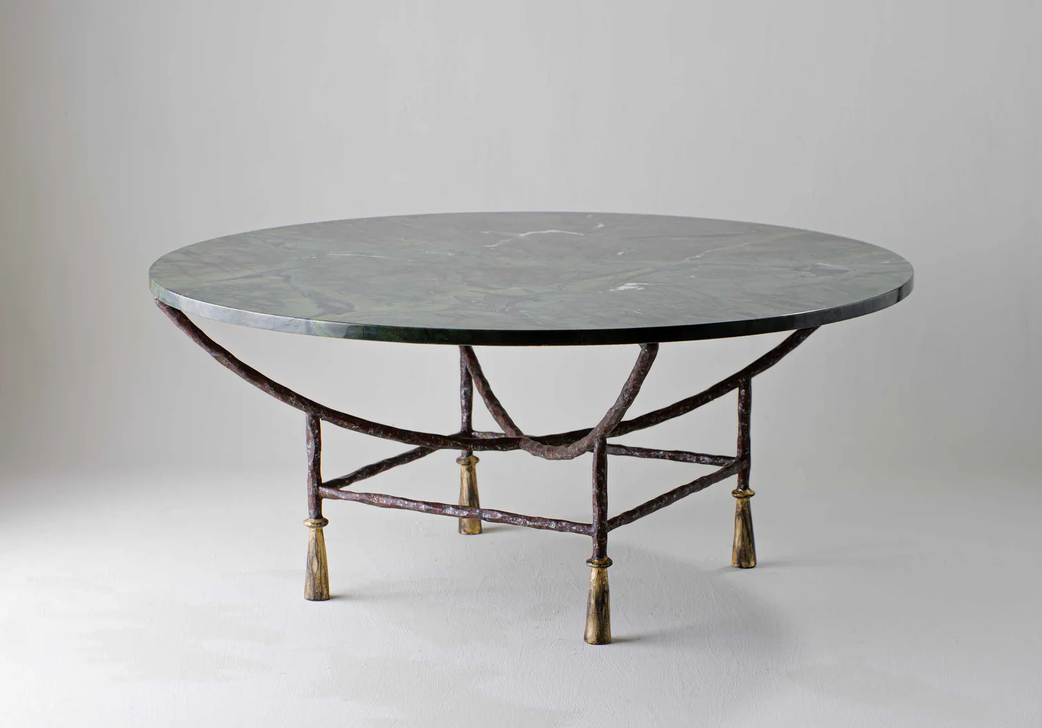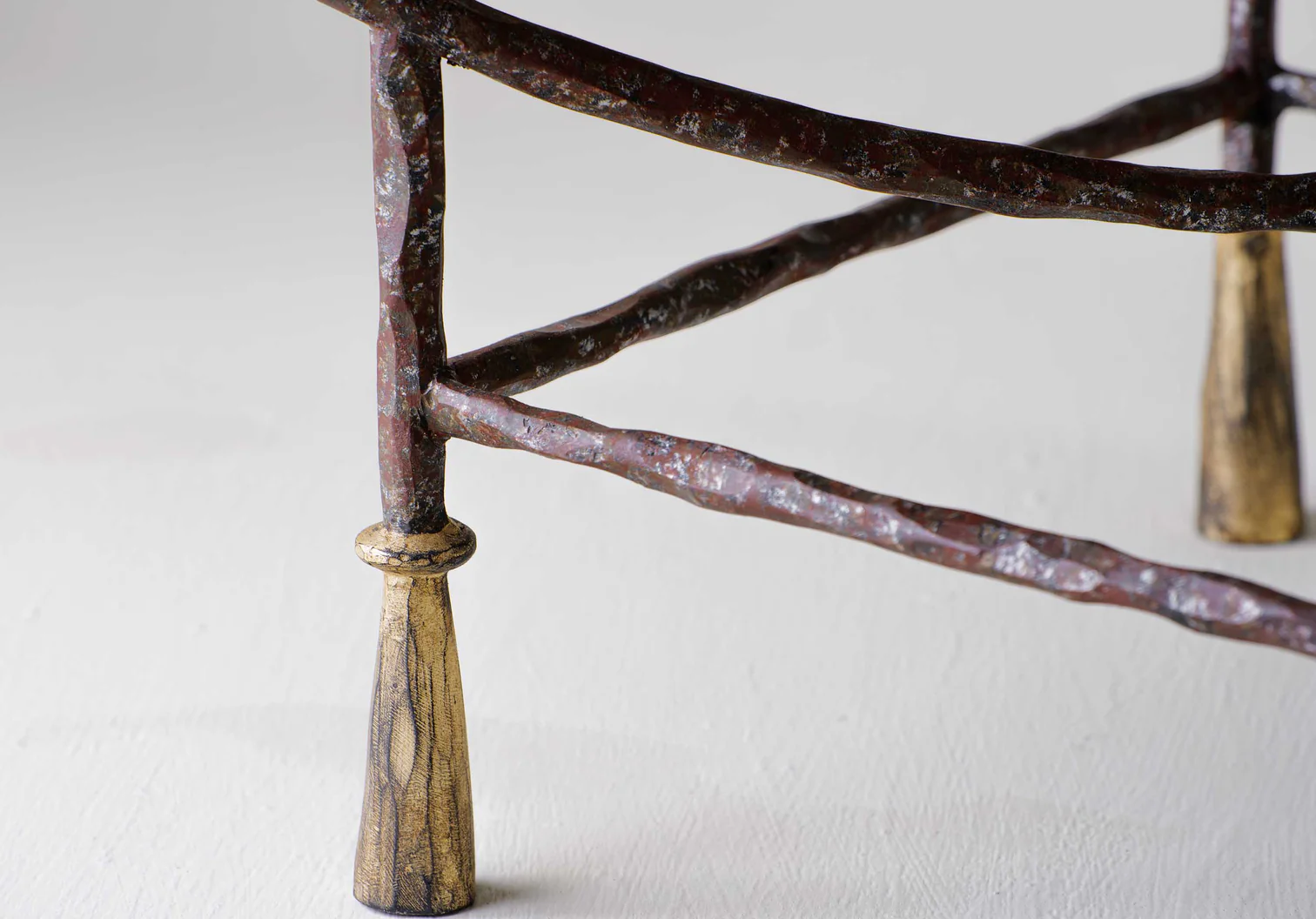 Inspired by the furniture of Diego Giacometti, the Stanley Coffee Table is complete with decorative end pieces and hammered conical legs and can be custom made in any size or finish.