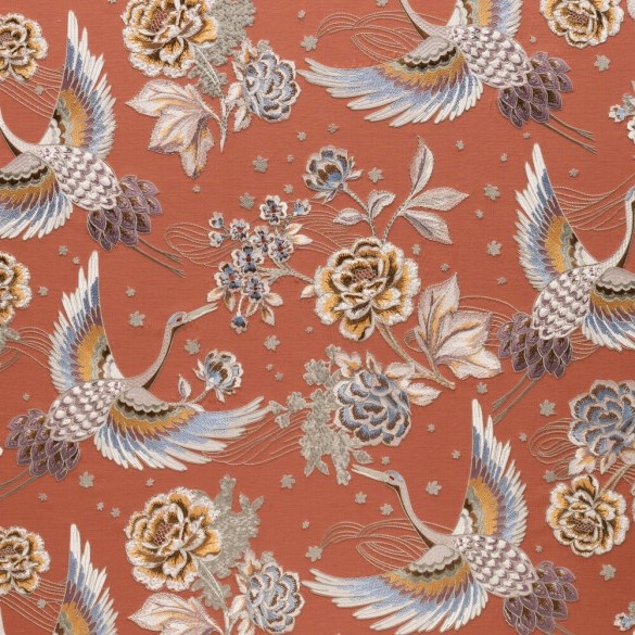 This striking pattern consists of flying cranes, which are considered a real good luck charm in various Eastern countries. They are embroidered on a cotton and linen fabric; a combination with a rich result.