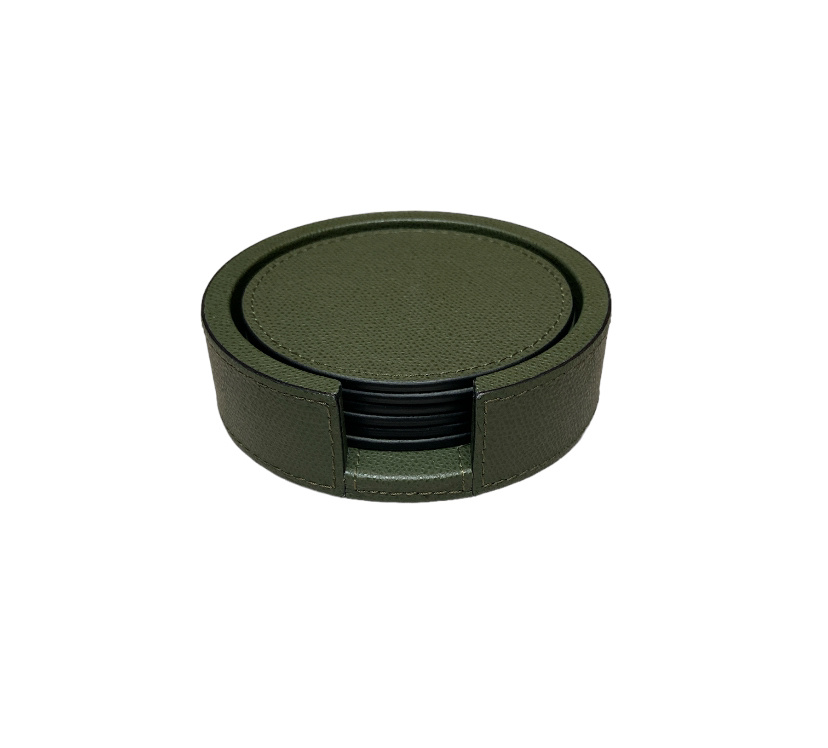 Tao Coasters Holder Round With 6 Tao Coasters Printed Calfskin Golf (TP175) - Loden Green (G02)
