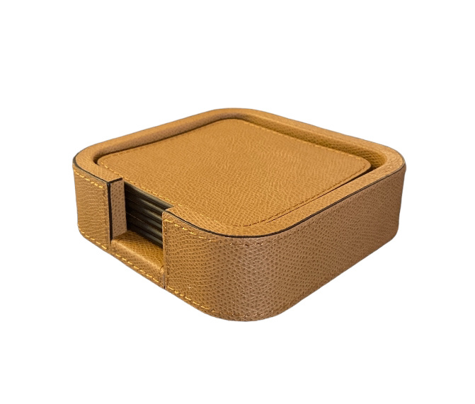 Tao Coasters Holder Square Rounded With 6 Tao Coasters Printed Calfskin Golf (TP182) - Caramel (G51ST51)