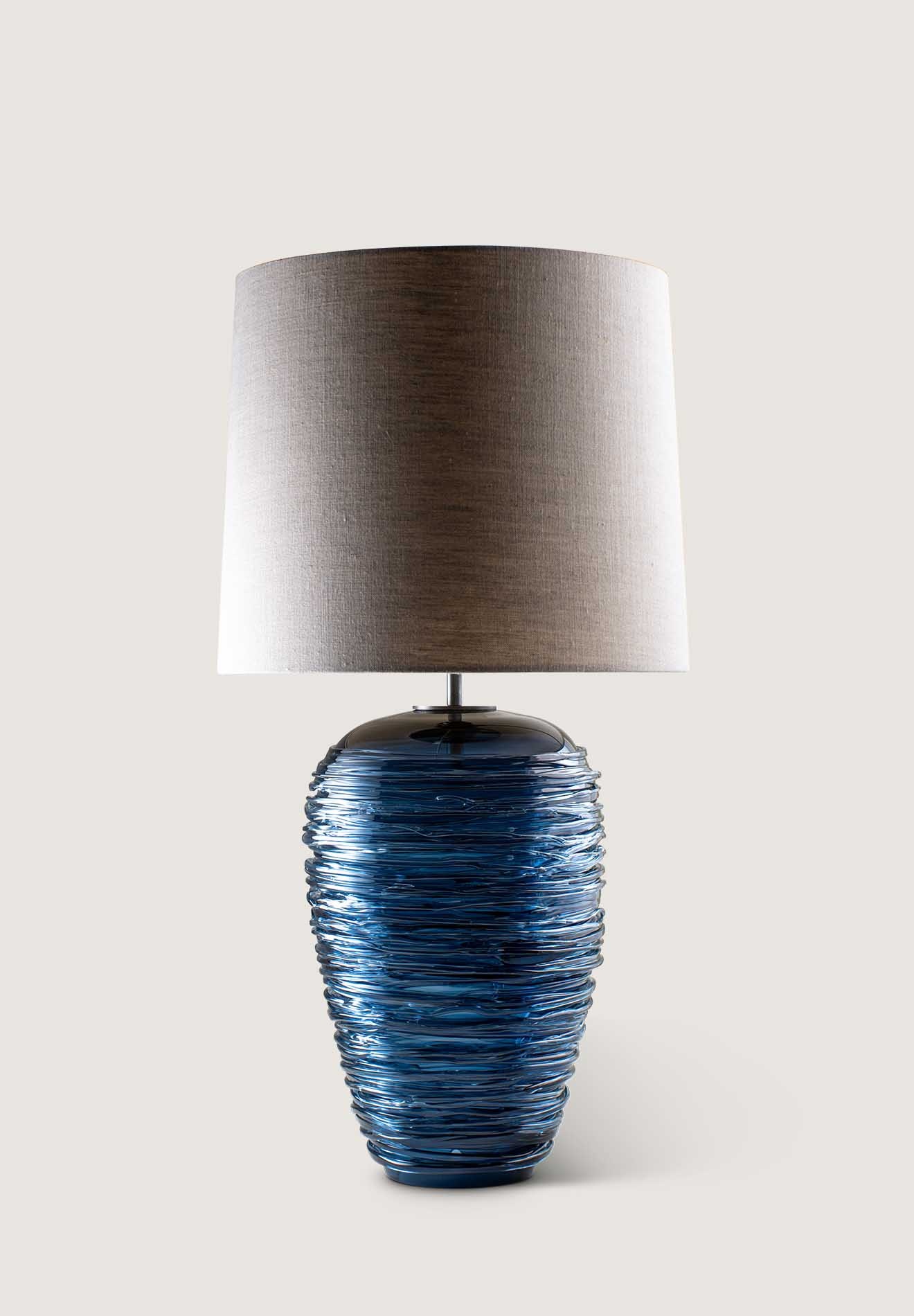Based on the same shape as the Blob Lamp, the Thread Lamp has a softer feel, thanks to the delicate glass wire wrapped across the entire surface of the piece. The base of the lamp is made in a variety of beautiful colors; the wire is always done in clear glass.