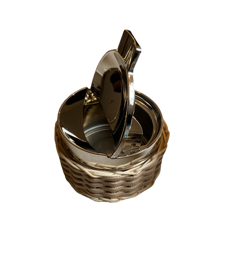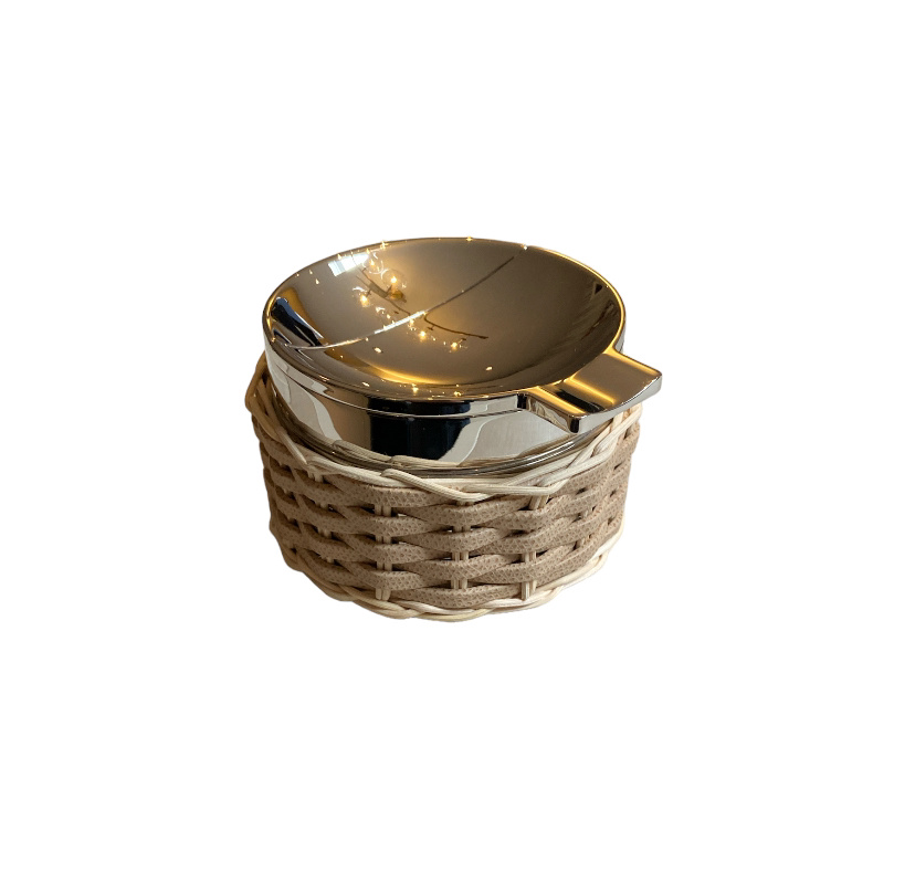 Structure of chrome-plated brass, partially lined with rattan. This windproof ashtray features an easy-to-clean ashtray and keeps areas tidy by locking cigarette butts and ashes in an enclosed chamber.