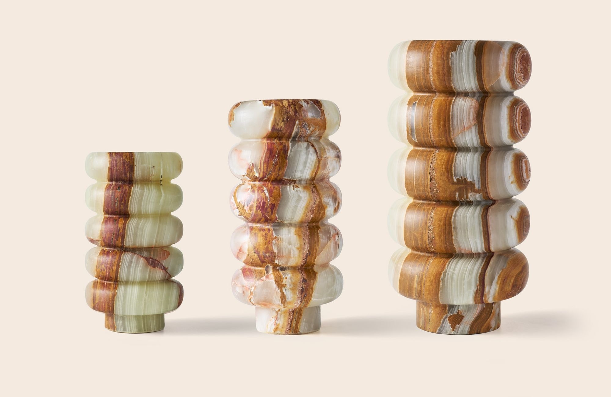The Zaconi Vase Veli is crafted from premium natural onyx, showcasing the stone’s rich veining and soft, warm tones. Its sculptural silhouette and refined proportions make it a true centerpiece—whether styled with flowers, branches or displayed as an art object on its own.