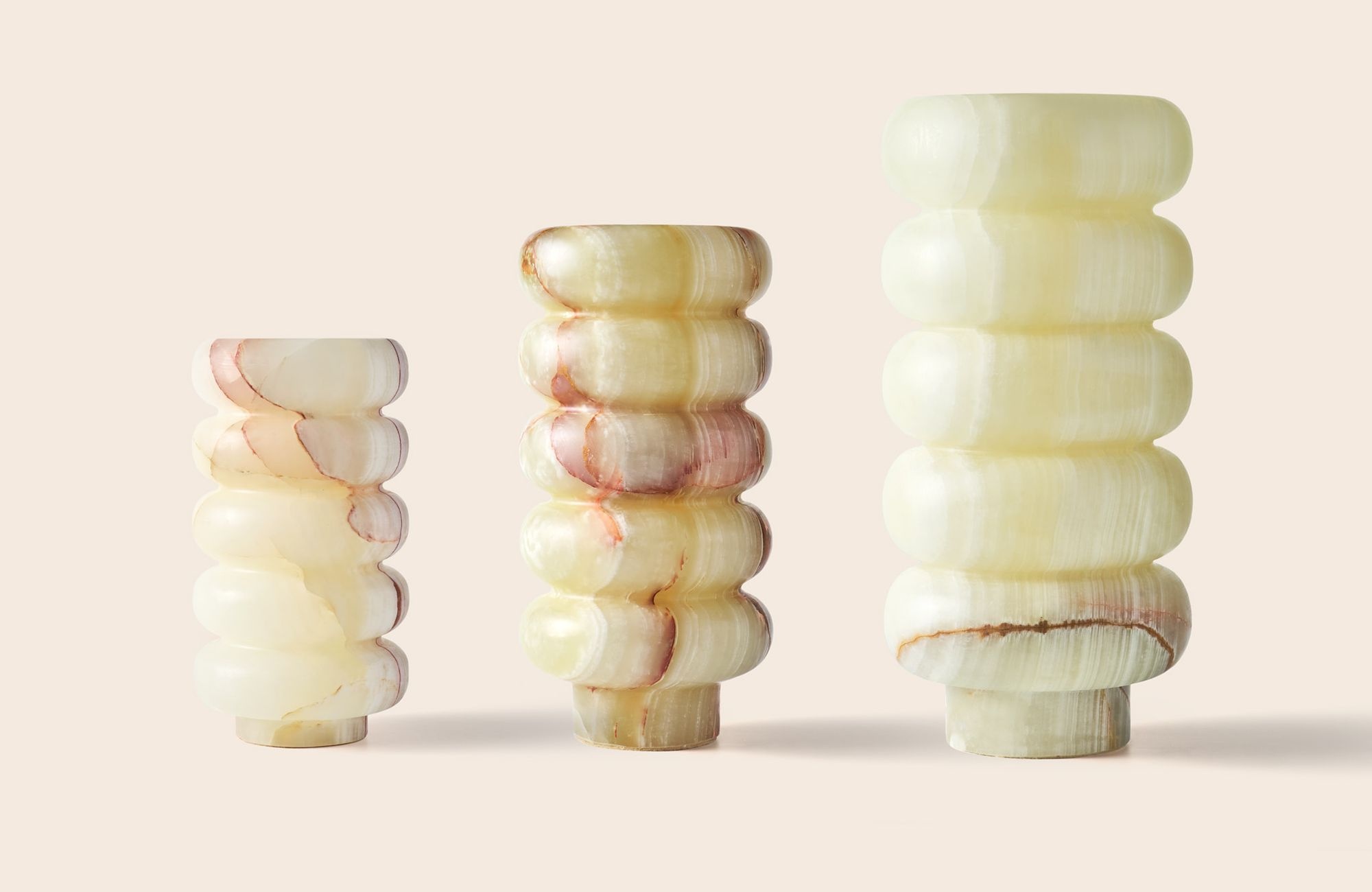 The Zaconi Vase Veli is crafted from premium natural onyx, showcasing the stone’s rich veining and soft, warm tones. Its sculptural silhouette and refined proportions make it a true centerpiece—whether styled with flowers, branches or displayed as an art object on its own.