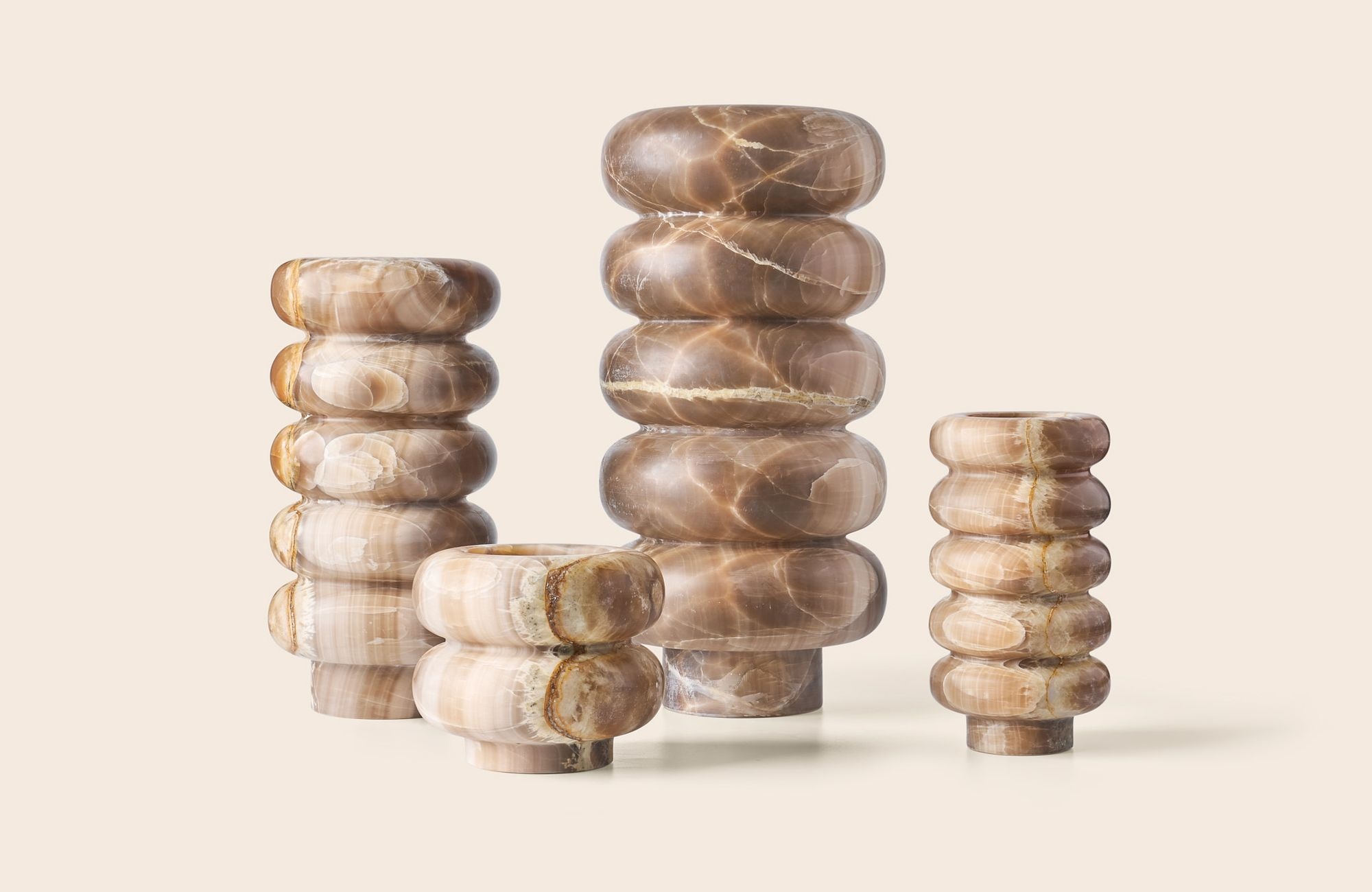The Zaconi Vase Veli is crafted from premium natural onyx, showcasing the stone’s rich veining and soft, warm tones. Its sculptural silhouette and refined proportions make it a true centerpiece—whether styled with flowers, branches or displayed as an art object on its own.