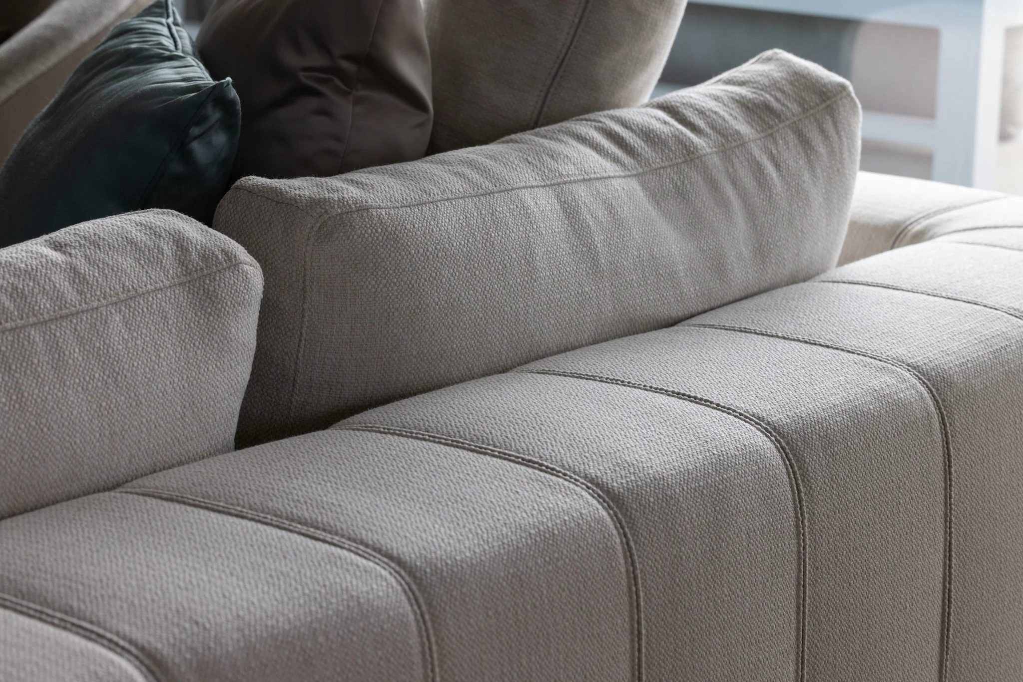 Modern designer sofa in soft canvas binding fabric. With adjustable backrests for ultimate seating and lounge comfort. Luxurious look, lasting comfort.