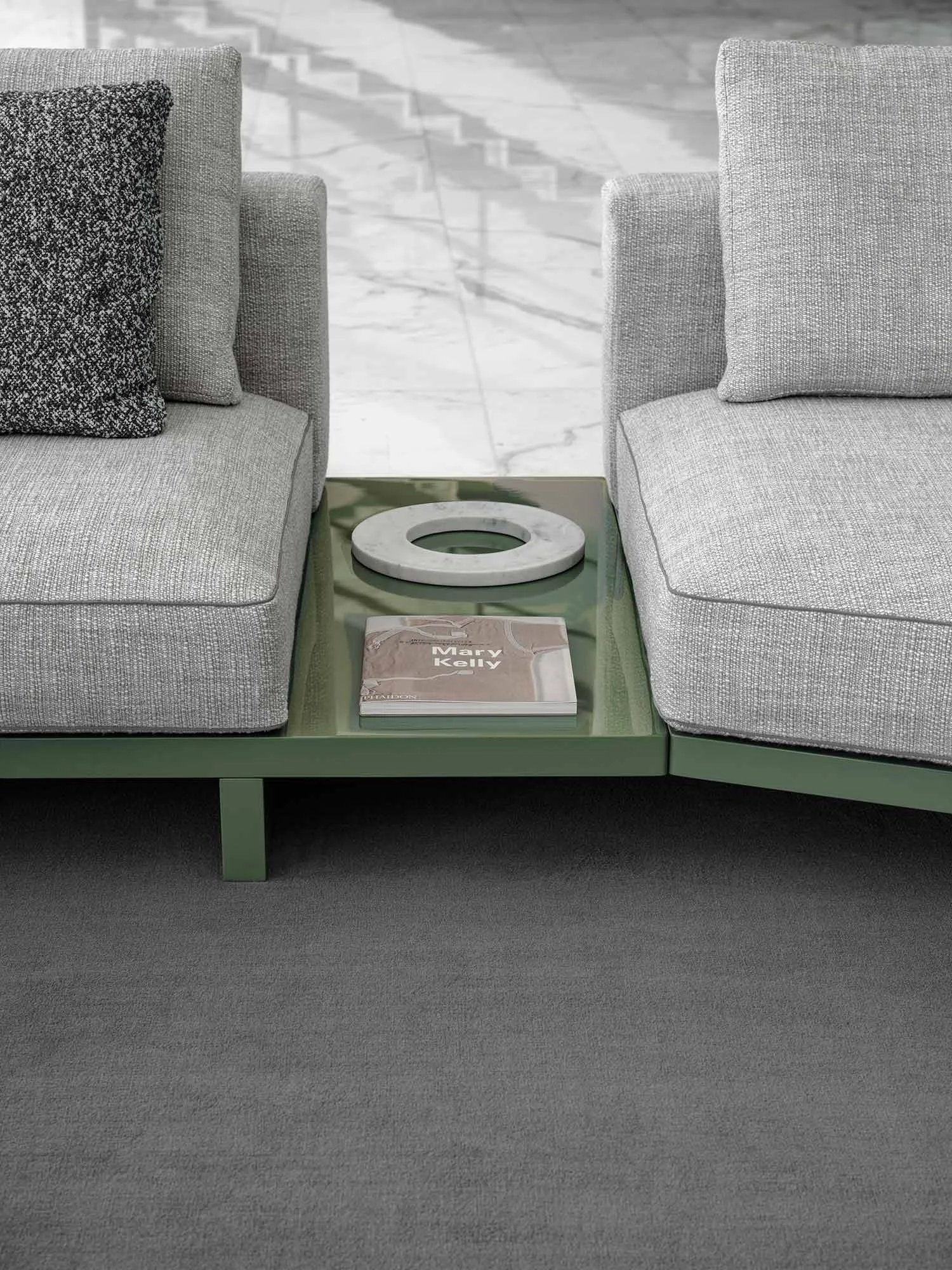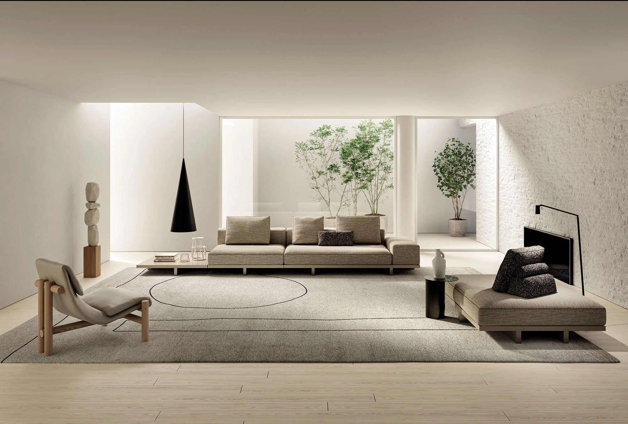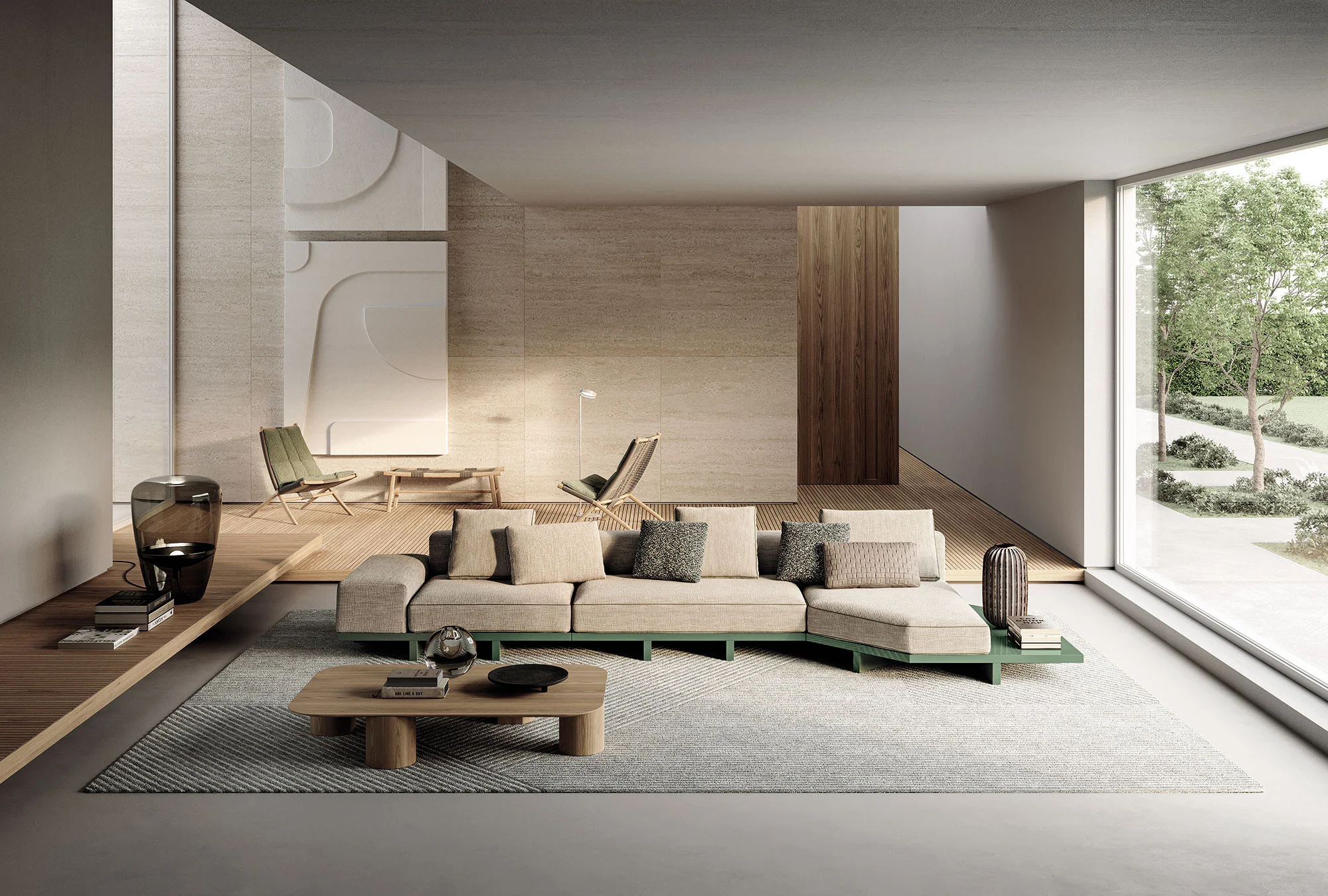 View is a contemporary modular sofa that blends creative freedom with refined craftsmanship, offering an architectural platform system enriched with integrated accessories.
