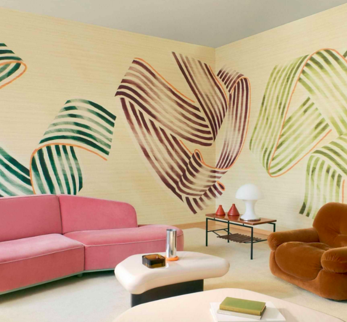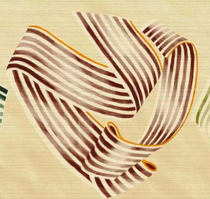 Make a bold design statement with Vol-au-vent by Elitis: a panoramic composition of floating painted ribbons on a silky backdrop. Playful, elegant and striking.