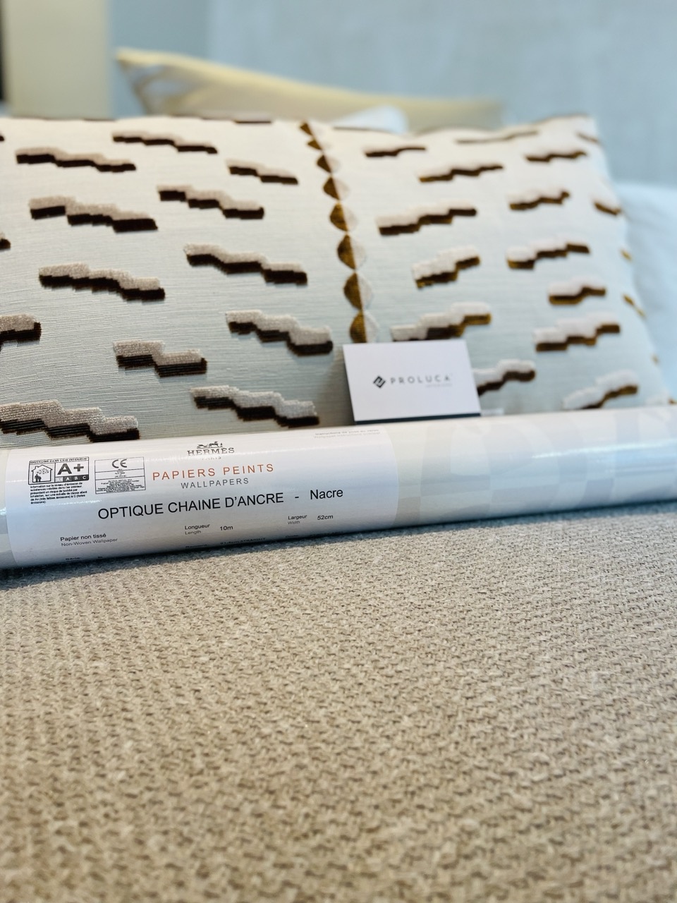 Discover the exclusive charm of Hermès' "Optique Chaine D'ancre - Nacre" wallpaper, now available at Proluca Interiors. With a limited stock, this wallpaper is an exclusive addition to your interior.