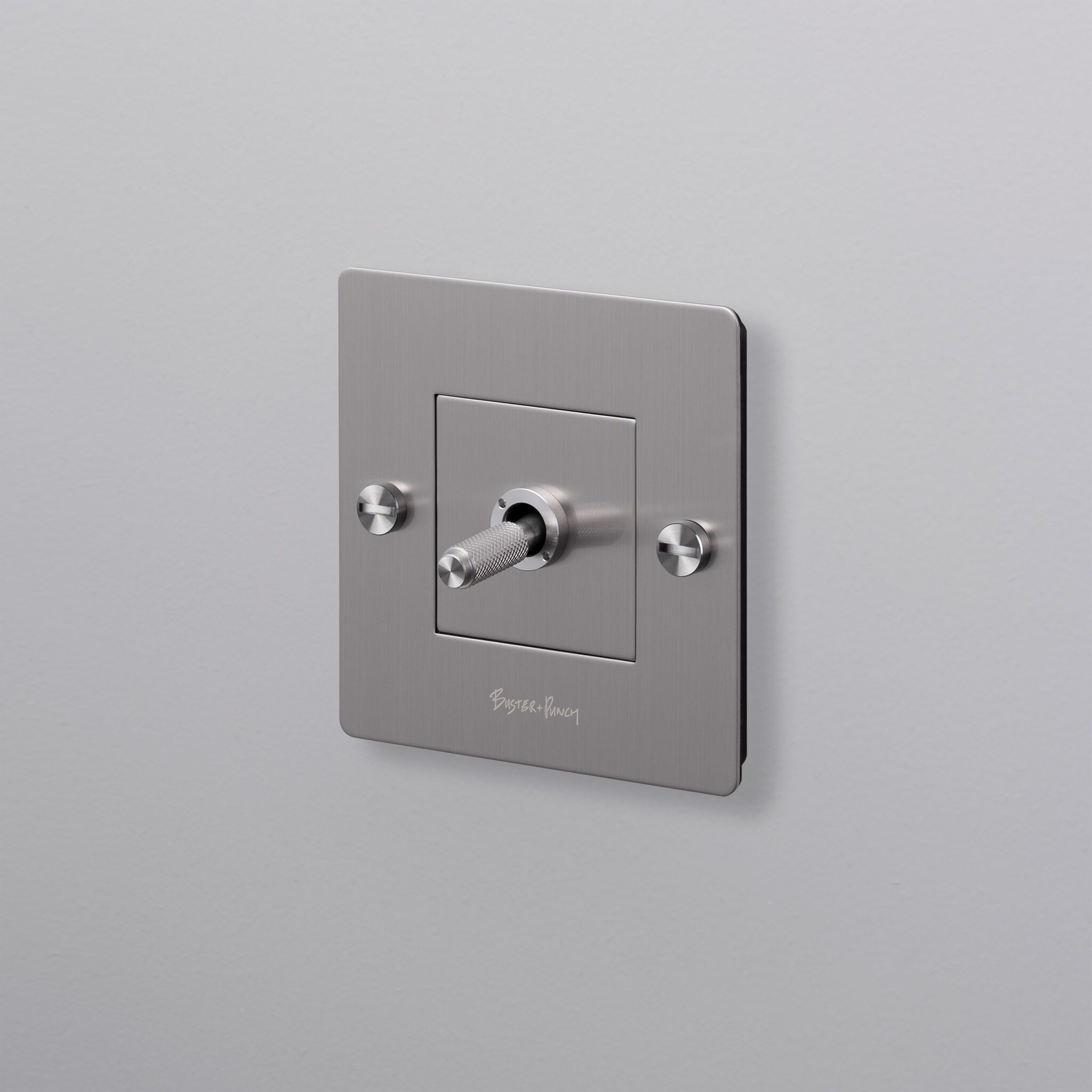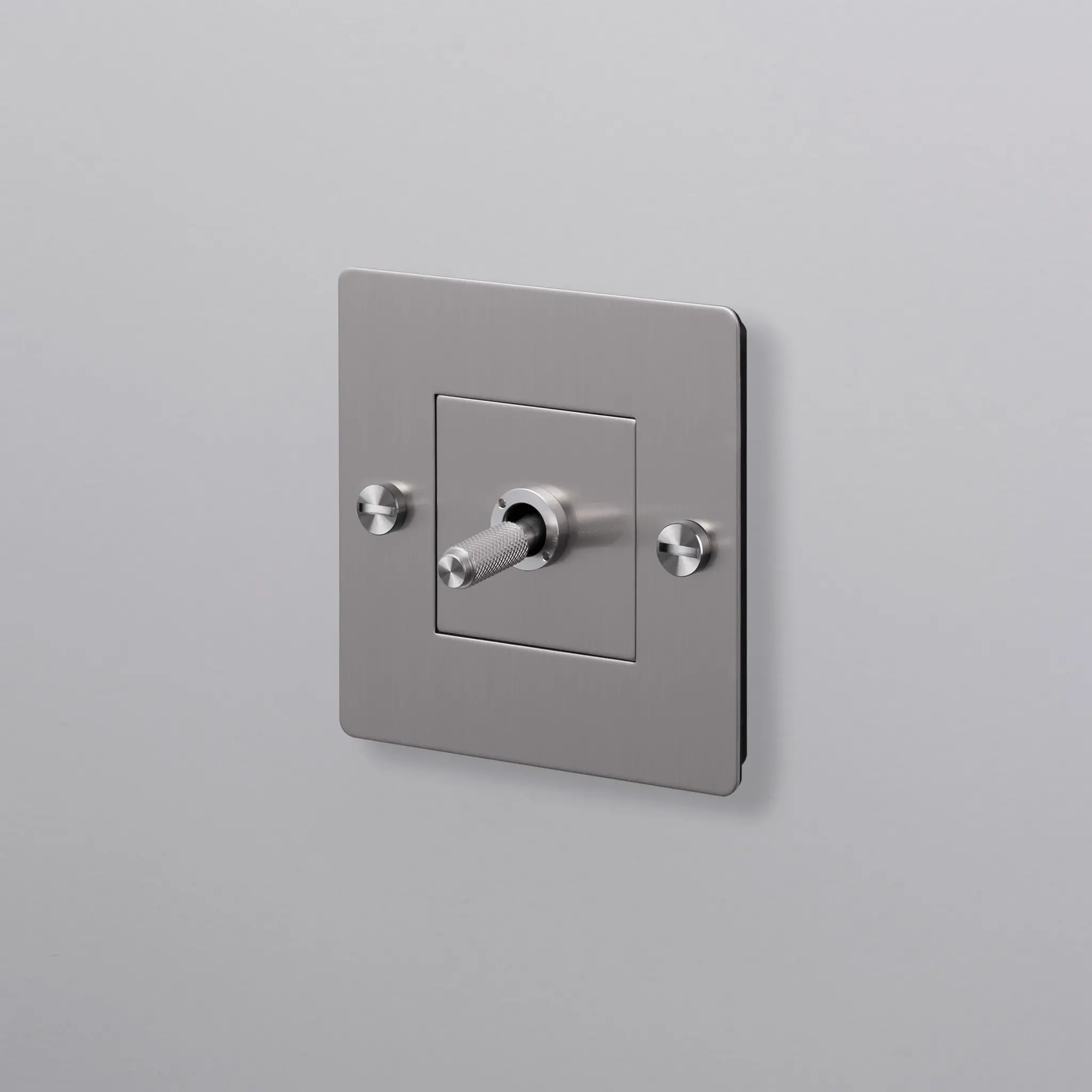 Stijlvolle 1G 2-weg toggle switch van staal met massief metalen hendel en diamantgeslepen knurl patroon. Ideaal voor schakelingen op meerdere locaties. Combineert luxe design met functionaliteit.