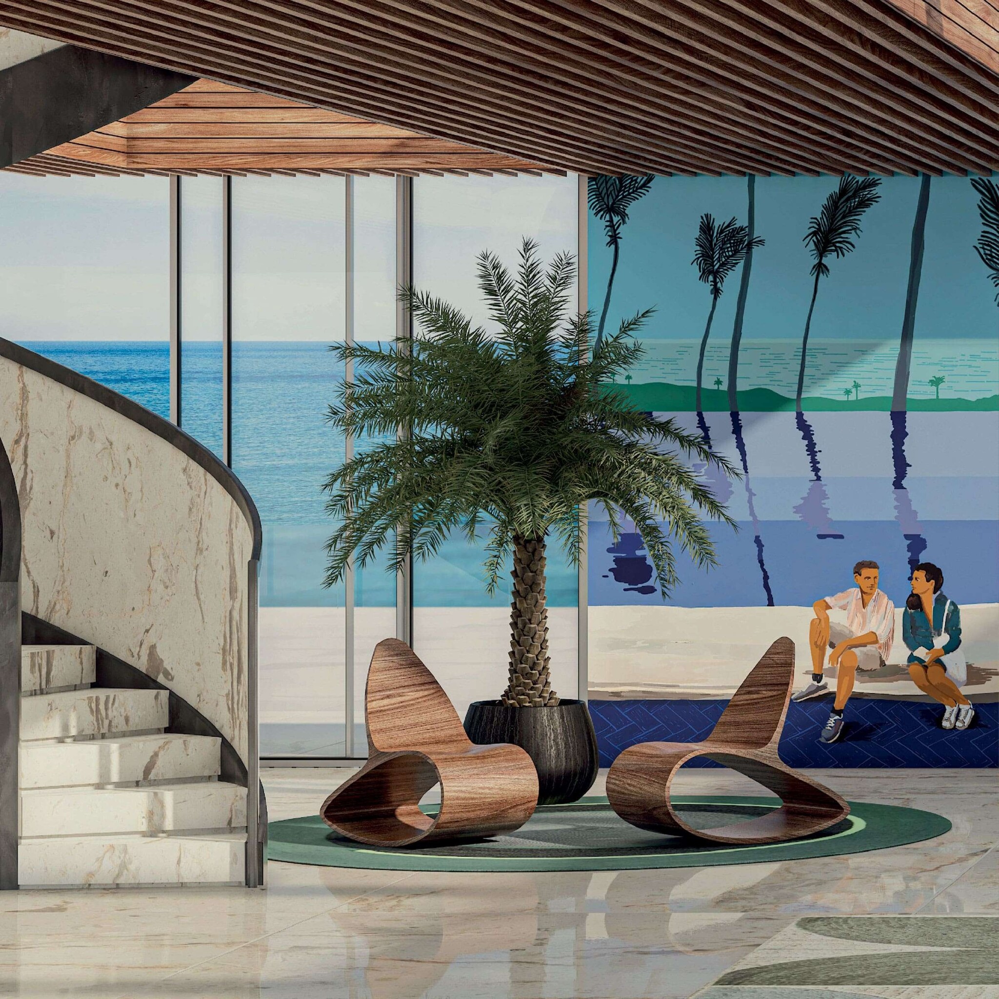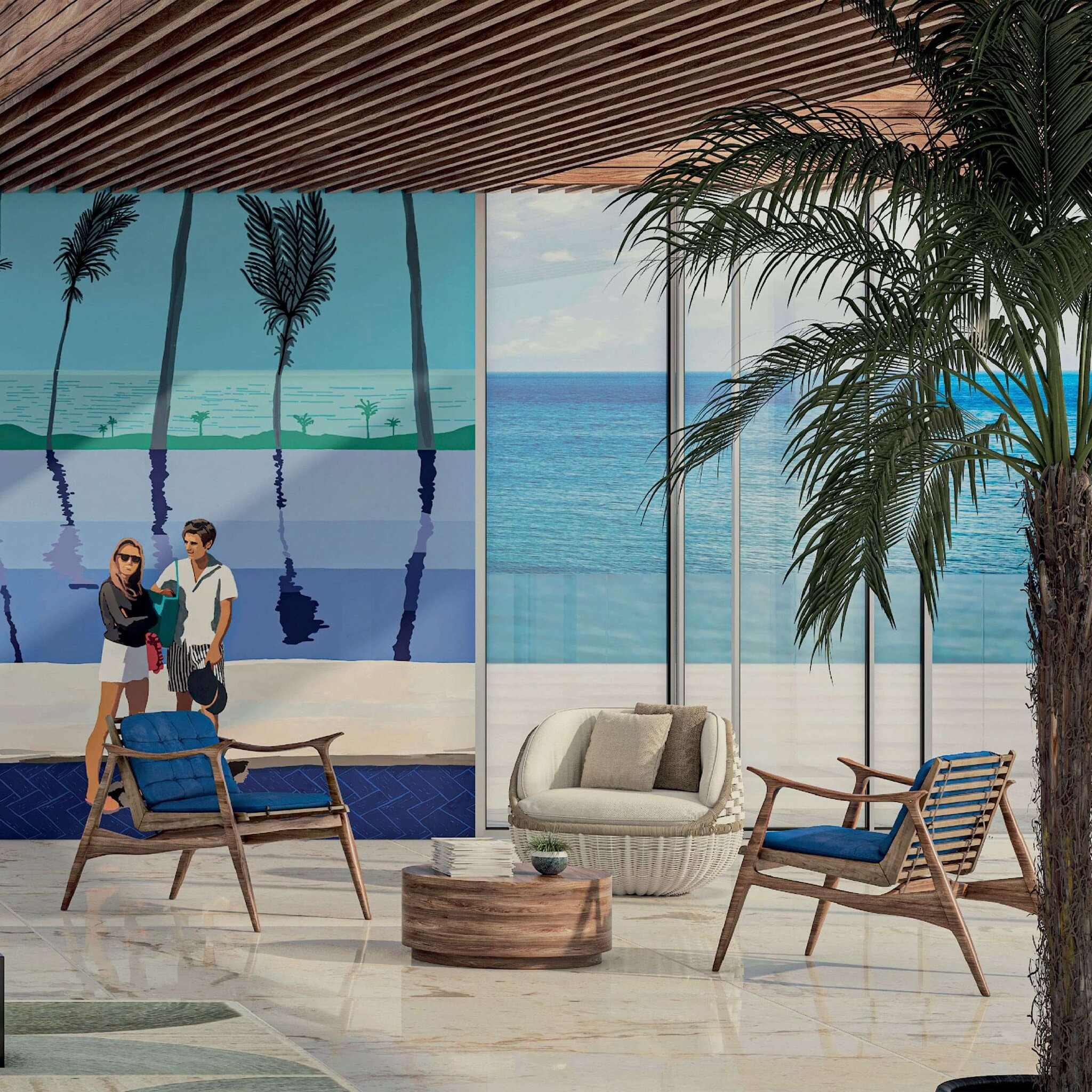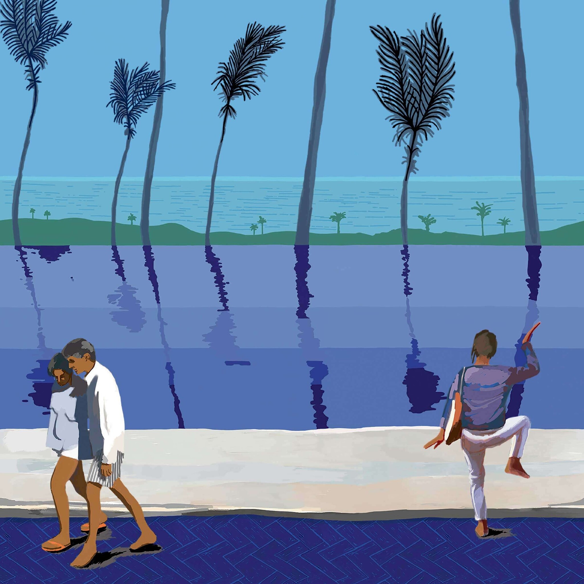 Panorama Siempre van Elitis. Dit panoramabehang uit de 360 collectie is een zomers panorama langs de boulevard aan de kustlijn vol palmbomen. De personages bewegen zich vrijelijk langs dit uitgestrekte panorama.